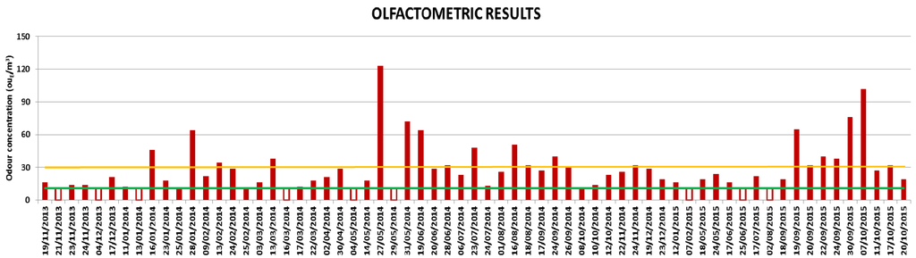 The exceedance of the chosen routine (number of calls per index of intensity in one hour) automatically activates the two remote samplers, located in the area, in order to collect samples of odorous air, then analyzed according to dynamic olfactometry methodology. Overall, 70 odor events were detected by remote sampling up to October 2015, 50 of which were in 2014 and the remainder in 2015. So, a significant decrease has been verified in 2015, as confirmed even by receptor feelings, but it has to be underlined that half of the odor events in 2015 occurred in September–October 2015, indicating a renewed exacerbation of the phenomenon. Figure 5 displays the maximum odor concentrations, expressed in ouE/m3, measured for each odor event. The empty bars indicate the events for which no odor concentration has been objectively detected; 11 ouE/m3 (shown with a green line) represents the instrumental quantification limit for the olfactometric laboratory. The orange line in the graph corresponds to 30 ouE/m3; this value has been chosen to define a limit to identify the most significant odor events. The choice of this criterion is derived from the analysis of the olfactometric concentrations measured for “blank” samples, as described below.