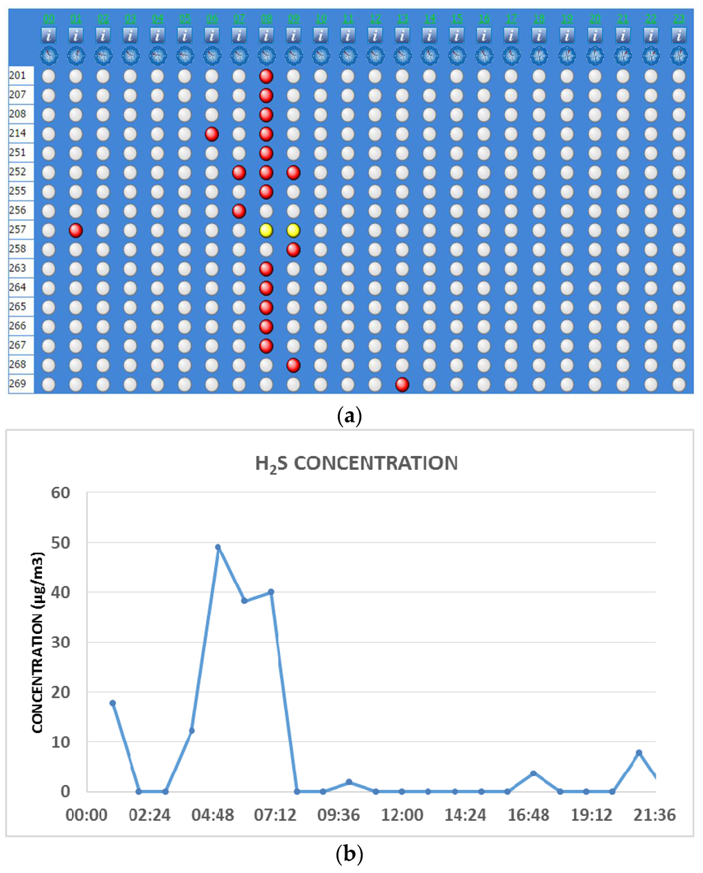 (a) Synoptic hourly visualization of complaints recorded by Odortel® on 1 August 2014 (each row refers to the annoyed receptor and each column indicates each hour of the day); (b) Analytical responses of H2S concentrations, recorded on 1 August 2014.