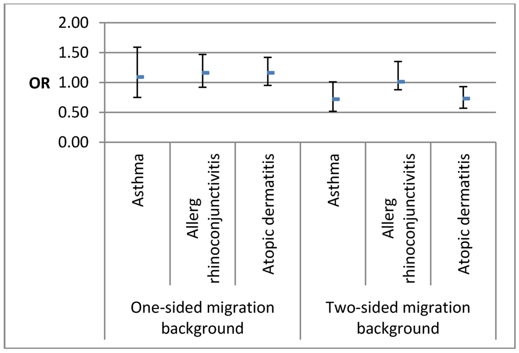 Associations between atopic diseases in the last 12 months and migrant background were investigated in multiple logistic regression models in order to find out whether migrant background is an independent determinant for the diseases. The results show that children and adolescents with a two-sided migrant background had about one-third less often the chance of having atopic dermatitis (OR 0.73, 0.57–0.93) (Figure 1), independent of sex, age, socio-economic status, mold-infested rooms, smoking mother and/or father, living environment, birth order and parental atopy. On the other hand, we found asthma to be about one-third less likely in children and adolescents with a two-sided migrant background as compared to those with no migrant background, but the association was not statistically significant (OR 0.72, 0.52–1.01). Moreover, we did not find statistically significant differences for any of the atopic diseases in children and adolescents with a one-sided migrant background compared to non-migrants (Figure 1).