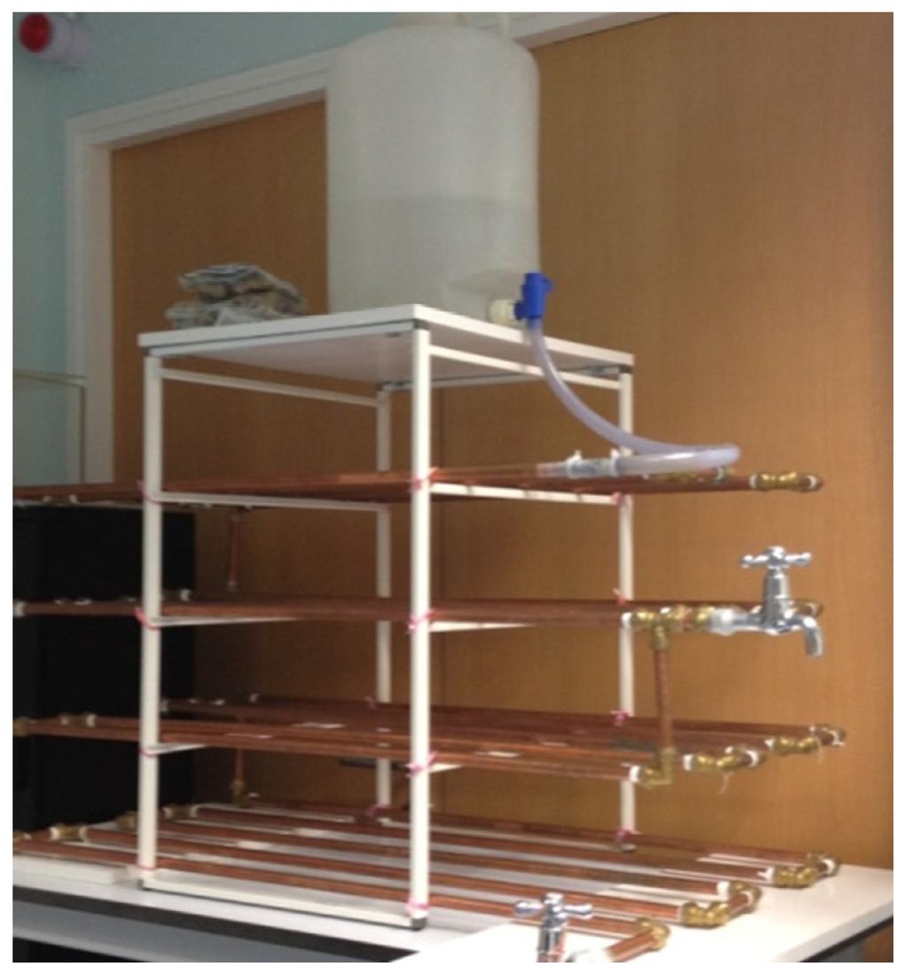 The system consists of approximately 20 m of certified (BS EN1057:2006) copper pipes (0.5 inch dia), (BS EN1254-2:1998) brass fittings (Figure 2) and stainless steel taps. The required copper pipe length is based on the average household floor area of about 95 m2 in Singapore [30]. The total capacity of the system is approximately 2.8 L. The first stage of the experiment (conditioning phase) was to identify a potential lead source in the system using a modified sampling method. The second stage was to examine the effects of orthophosphate, a common corrosion inhibitor, on lead release from the identified lead source. The third stage was to assess the effects of stopping orthophosphate addition on lead release.