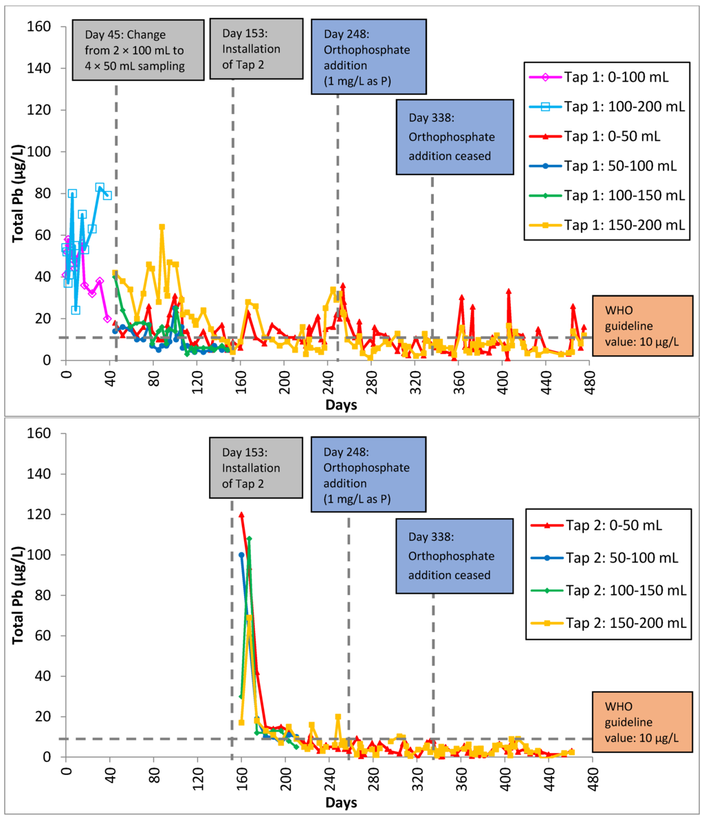 - Hayes, C.R.; Incledion, S.; Balch, M. Experience in Wales (UK) of the optimization of ortho-phosphate dosing for controlling lead in drinking water. J. Water Health 2008, 6, 177–185. [Google Scholar] [CrossRef] [PubMed]