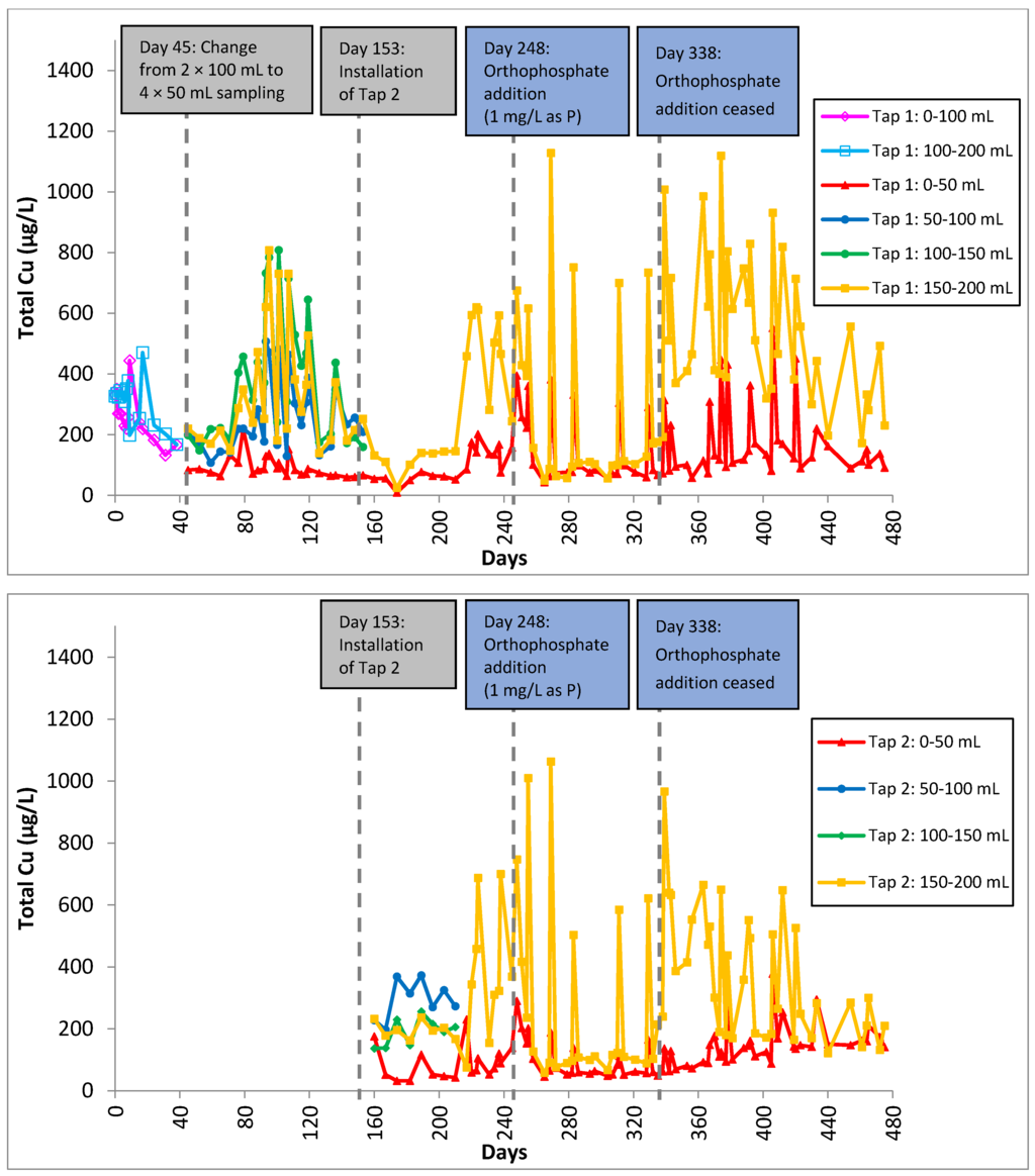In this study, a modified sampling protocol was used to detect lead contamination in a premise plumbing system and locate lead sources within the system. The sampling protocol requires sequential sampling of 50 and 100 mL for the first 200 mL after a stagnation period of one, three or seven days. Sequential sampling using 100 mL was sufficient for detecting lead contamination while using 50 mL could effectively locate the lead source. “Lead-free” brass fittings were identified as the source of lead contamination. During the first 247 days of conditioning, lead levels far exceeded the WHO guideline value of 10 µg·L−1. Tap installation on Day 153 caused short-term spikes in lead release for two weeks. Hence, residents moving into new buildings or renovating their plumbing systems are potentially at risk of lead contamination in their drinking water. Orthophosphate was effective in suppressing total lead levels below 10 µg·L−1, but caused “blue water” problems, most likely due to excessive copper phosphate formation. When orthophosphate addition was ceased, total lead levels began to spike within one week, suggesting that a continuous supply of orthophosphate was required to control total lead levels. All samples collected after stagnation showed an increase in pH while orthophosphate addition resulted in the highest pH increase of up to 1.92 pH unit. The main strengths of this study are the measurement of copper and zinc on top of lead and the long experimental period. Copper and zinc are major components of brass, while lead is usually present in negligible amounts. The release of lead from brass is, however, related to zinc content in brass, i.e., the higher the zinc content, the higher the lead release [51]. The system was assembled in the laboratory using all-new plumbing materials and only certified copper pipes, brass fittings and stainless steel taps were used without any tapes, sealants and solders that may be present in field sampling. Many studies in the literature used either relatively short lengths of pipe (3 m) or single fittings to represent real distribution systems, while this study is specifically designed to represent real premise plumbing systems that use copper pipes. The long experimental period allows us to show that lead contamination can be persistent in premise distribution systems and helps to fill the knowledge gap in the existing literature. It should be noted that the findings presented in this study are specific to premise systems made up of primarily copper pipes and brass fittings and may differ from systems of different materials or dimension. The approach in tracing lead sources (or other contaminants) in a premise system by performing sequential sampling and adjusting sample volumes should still work for other systems. This study can be further improved by incorporating the measurement of soluble lead concentration to differentiate the contribution of soluble and particulate lead to the total lead level, adopting a higher sampling flow rate to investigate the potential high contribution of particulate lead to lead contamination, and using shorter stagnation periods to represent the daily usage of water.