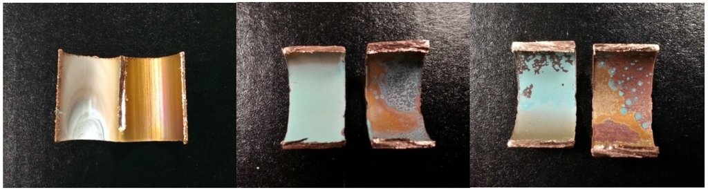 Cross-section of a copper pipe segment (left) after conditioning with tap water for 100 d, (middle) after 367 d orthophosphate addition and (right) after 433 d orthophosphate addition ceased.