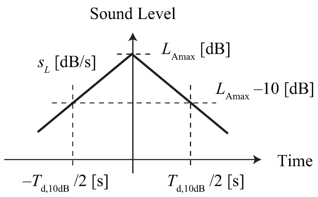 Assumed fluctuation of a single noise event, where sound level linearly increases and decreases. The slope of a single noise event () and the 10 dB-duration of a single noise event () correspond to Equation (11).