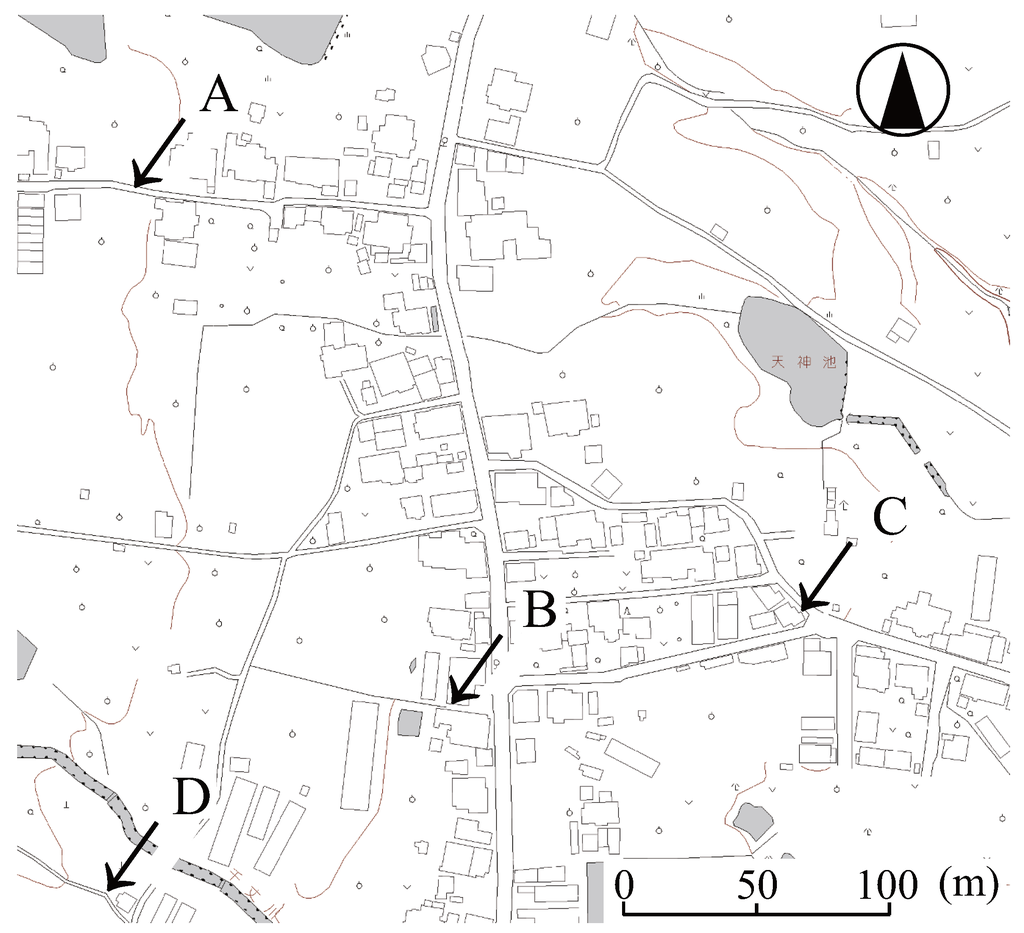 Measurement points in a Kyoto city suburb (Ooenishinaga-chou, Nishikyou-ku, Kyoto city, Japan). Measured Point A was located alongside a quiet road and opened to an urban road where a number of automobiles passed through; B was located alongside the urban road; C was located near a Y-shaped intersection where a few automobiles passed through and opened to the urban road; and D was located in a residential district and not opened to any major roads.