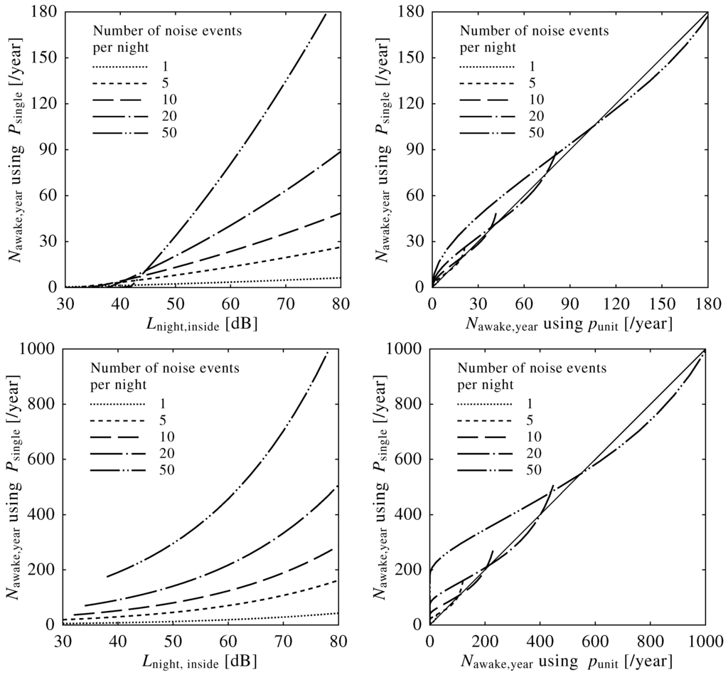 While the over- or under-estimates the number of awakenings in response to noise events during night-time, the index considers the expected number of awakenings (or probability of awakening) per year, which would be appropriate since awakenings during sleep might cause adverse health effects. This index has already been defined as a summation of the awakening probability due to a single noise event calculated using equations, such as Equations (8), (9) or Equation (10). However, the calculation can only be performed under limited circumstances because the equation for the probability of awakening is confined to a specific sound source.