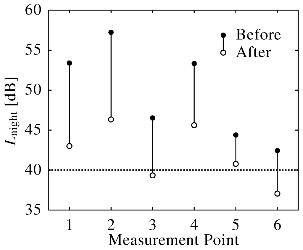 Figure 7 shows the reduction of traffic noise evaluated using (dB) (22:00–6:00). Although the decreased by 5–10 (dB) after the noise barrier was set up, we were unable to evaluate the mitigation of sleep disturbance from these measurements alone.
