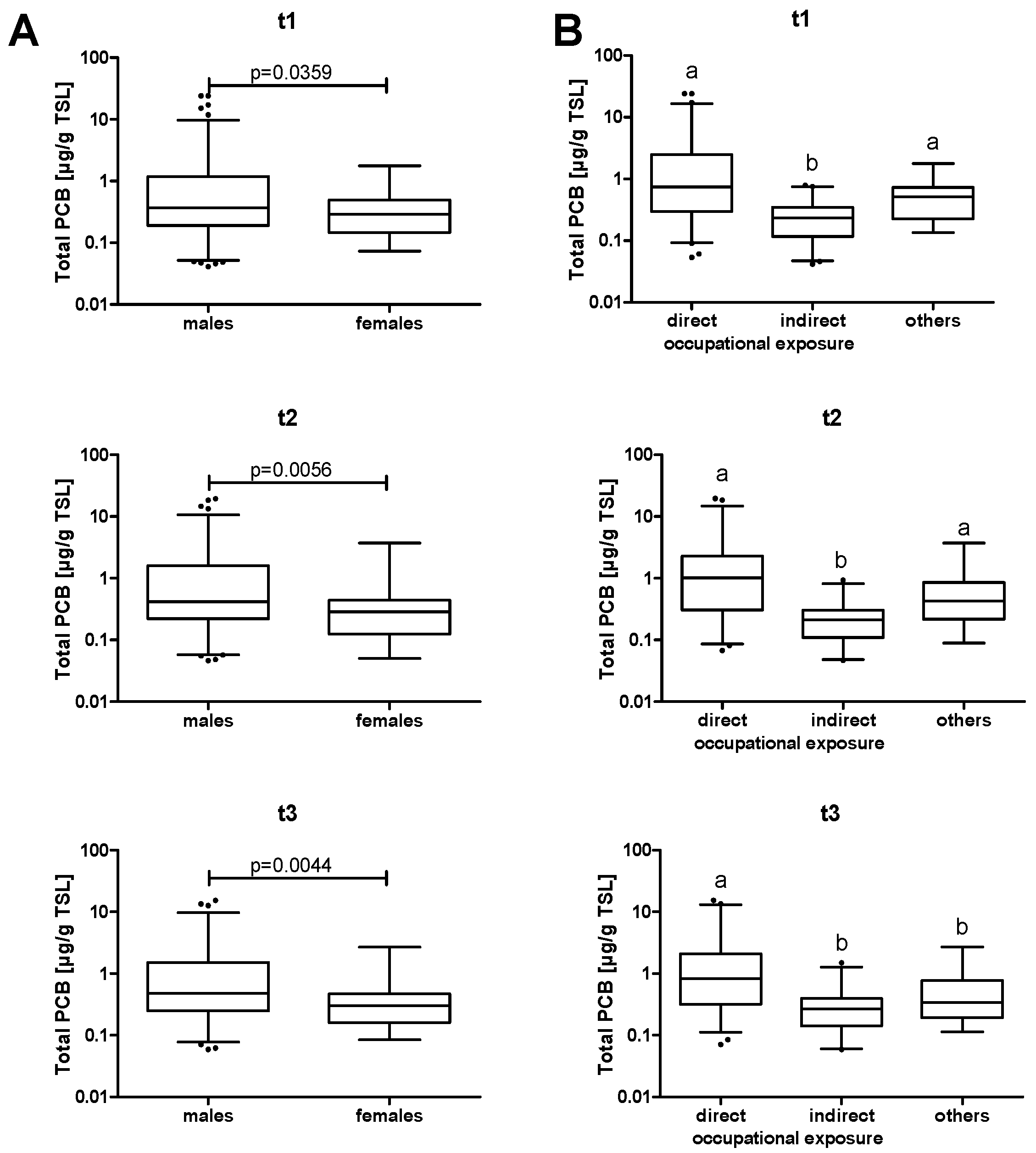 Total PCB burden. Data are shown as box plots depicting the median plasma concentrations. Whiskers represent the 2.5 to 97.5 percentiles. (A) Comparison between male and female subjects. Statistical significance of the difference between male and female subjects was calculated by Mann-Whitney U test. (B) Comparison between subjects depending on the route of exposure. Statistical significance was calculated by Kruskal-Wallis test. Statistically significant differences are indicated by the absence of shared letters.