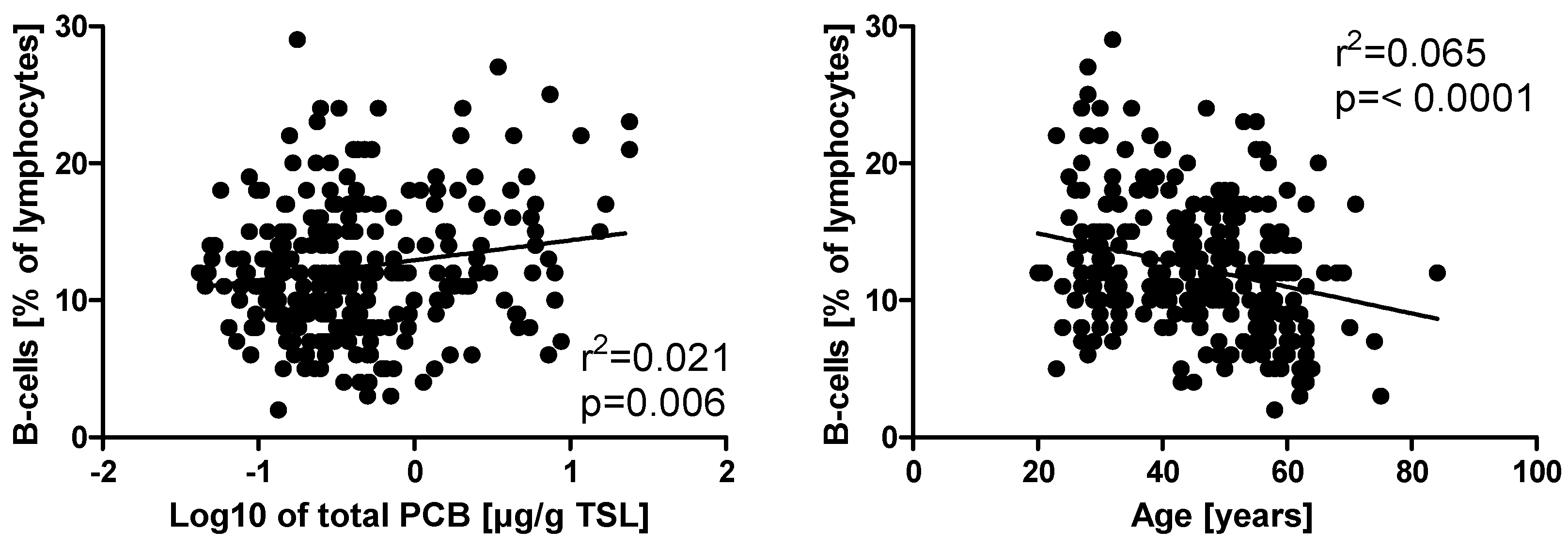 Correlation of the percentage of CD19+ B-cells among lymphocytes with total PCB burden and age. Lines represent the results of linear regression analysis.