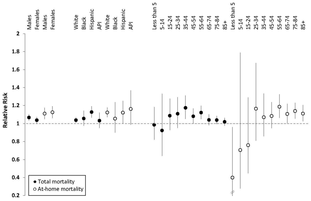 Heat wave relative risks (RRs) for total deaths (solid circles) and deaths that occurred at-home (hollow circles) by demographic group and 95% confidence intervals (CIs). Notes: Vertical lines represent 95% CIs; the CI for at-home deaths among those less than 5 years of age is wider than the RR scale; API is Asian/Hawaiian/Pacific Islander.