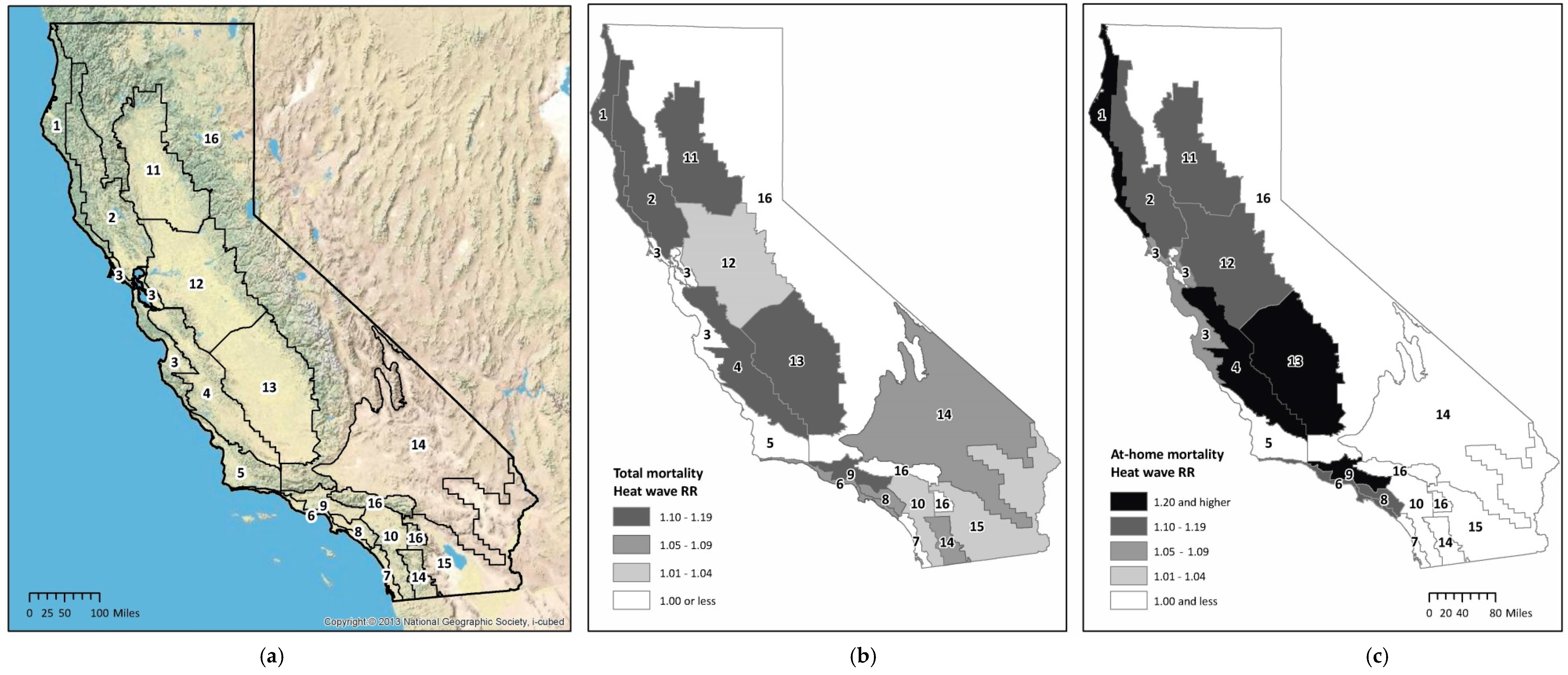 Heat wave total and at-home all-cause mortality relative risks (RRs) for California’s sixteen building climate zones: (a) California’s sixteen building climate zones and topography; (b) Total mortality heat wave relative risk by building climate zone; (c) At-home mortality heat wave relative risk by building climate zone.