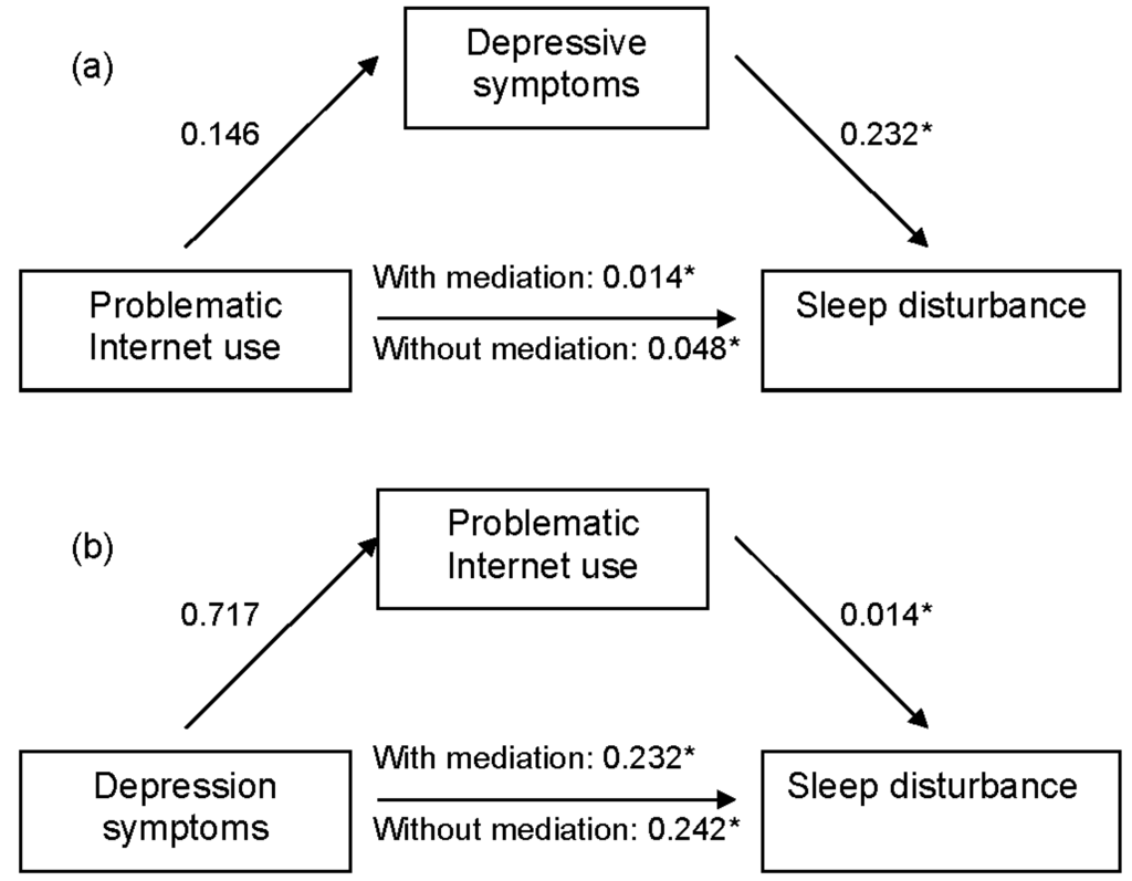 Mediation analyses of relationship between problematic Internet use, depressive symptoms, and sleep disturbance. (a) Depressive symptoms as a mediator variable between problematic Internet use and sleep disturbance; (b) Problematic Internet use as a mediator variable between depressive symptoms and sleep disturbance; * p < 0.001.