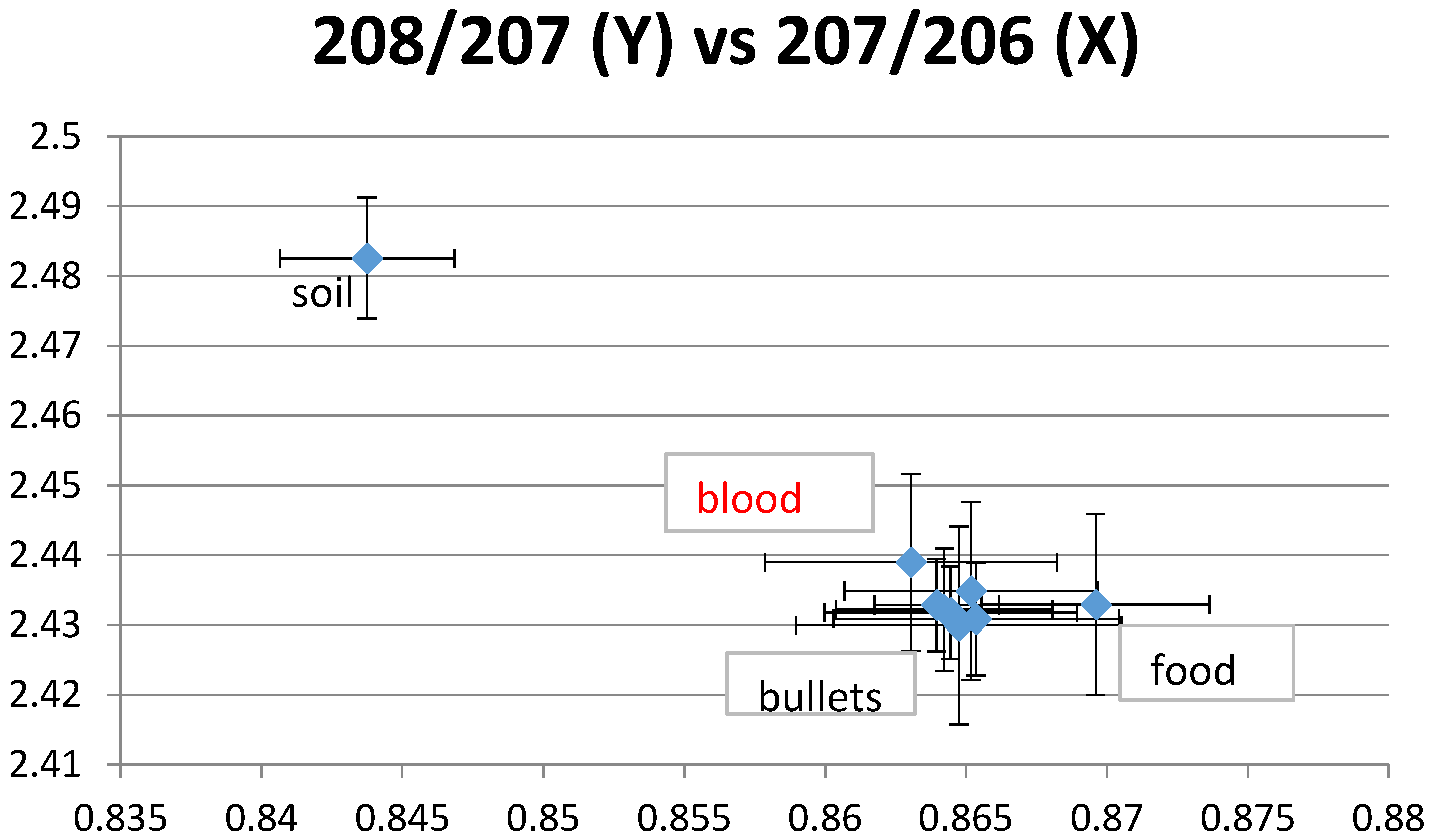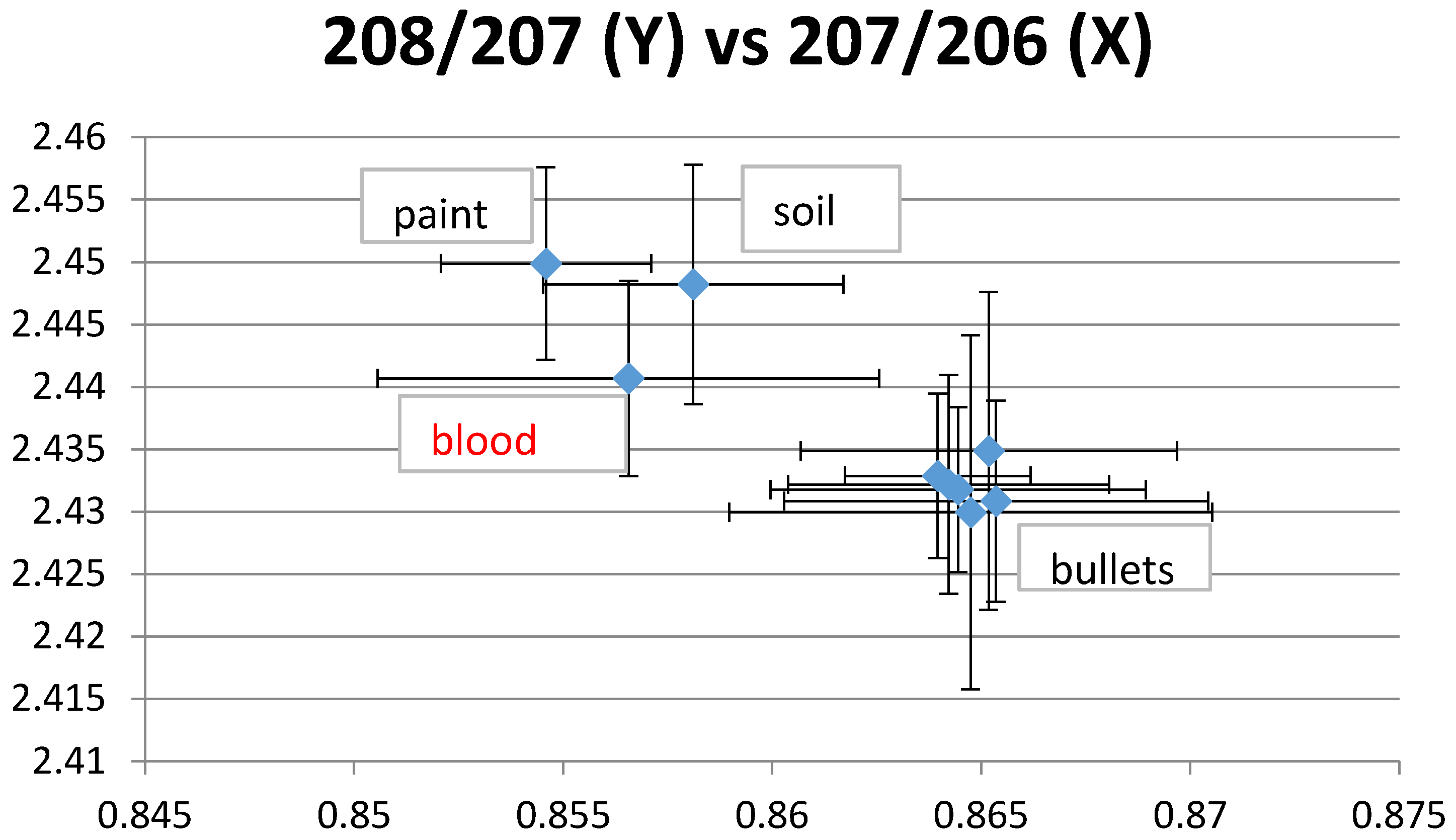 Example 1 of lead isotope ratios (LIRs). The plotted blood LIRs with their confidence intervals (±2 SD) intercept those of paint, soil and bullets.