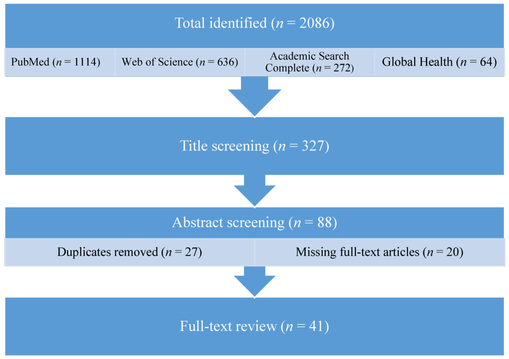 The primary literature search yielded 2086 references, with the majority of results from PubMed (53%). Title screening yielded 327 potentially relevant results. A secondary screening of abstracts yielded 152 potentially relevant papers; 88 remained after removing duplicates (27 articles) and references for which the full-text article was not available online (20 articles). Forty-one references were included after the final, full-text screening (Figure 1).