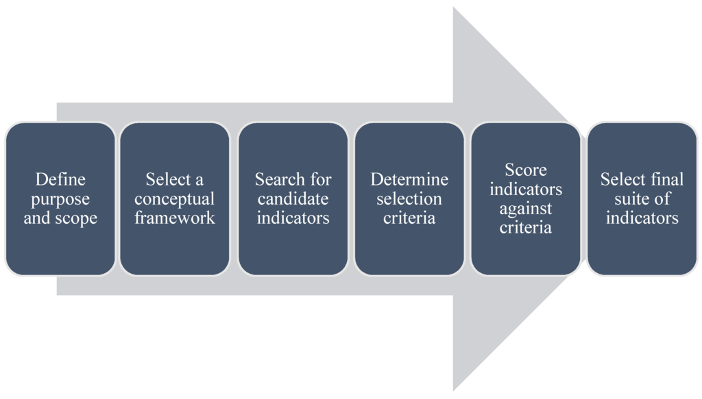 The adopted selection criteria can be used to screen candidate indicators. Each candidate indicator is scored for its suitability in relation to each criterion. The indicator is assigned a score of 0 if the indicator does not meet the selection criterion, or 1 if the indicator does meet the selection criterion. A score of 0.5 is assigned if the indicator meets the selection criteria in some instances and not in others.