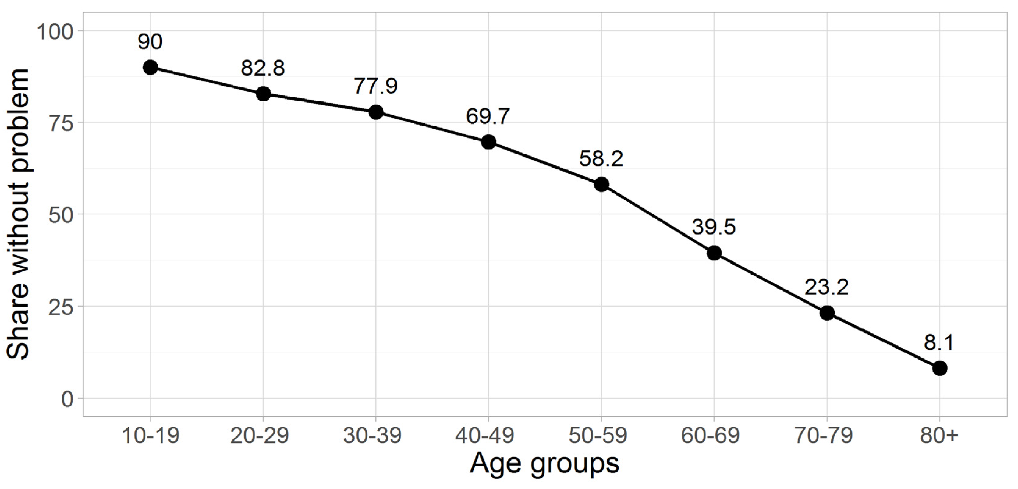 Percentage of respective age group without problem (EQ-5D-5L descriptive score: 11111), aggregated sample.
