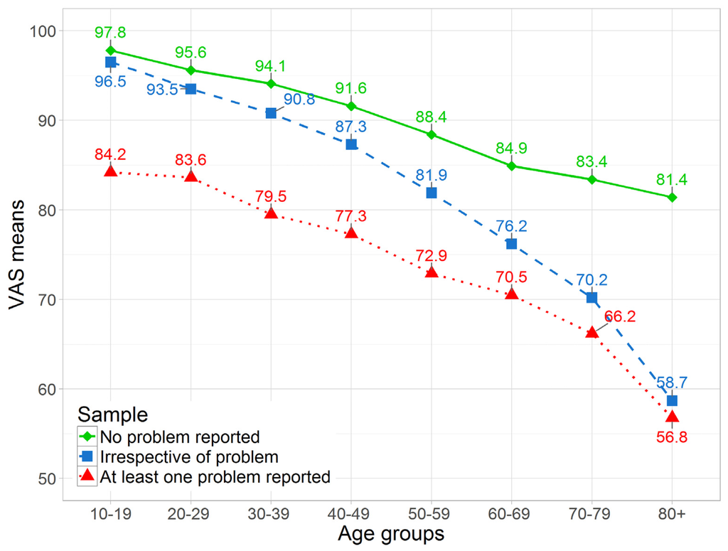 VAS means based on age group, stratified by optimal and non-optimal health state, aggregated sample. No problem reported shows the average VAS score for the subsample of participants with a descriptive score of 11111 (n = 3739). At least one problem reported refers to the subsample of remaining participants with at least one dimension score >1 (n = 2335). Irrespective of problem depicts the whole sample (n = 6074).