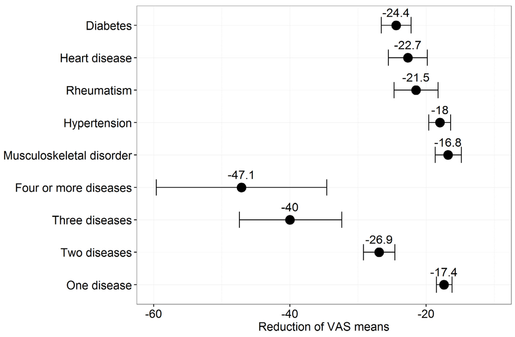 Thus, we evaluated the influence of diseases on HRQoL by aggregated sample. Figure 3 depicts the average reduction in VAS values (based on ANOVA) when disease is present. From a quantitative perspective, the presence of two diseases has a stronger negative influence on VAS mean than any of the single diseases. Due to the low number of observations for three and four diseases, the confidence intervals are very wide. Group affiliation (yes/no) was the only classification variable in this model. The widths of the 95% confidence intervals corresponded to the prevalence of the observed parameter. The higher the prevalence, the smaller the confidence interval. The VAS mean for having no chronic disease was 87.1 compared with 84.3 for the whole sample. Diabetes had the strongest negative influence on mean VAS value and led to a mean reduction of around 24.4 points. Of the five evaluated diseases, musculoskeletal disease had the lowest delta of around −16.8. The differences for the reduction in VAS means by disease, between years, were not significant (not shown, detailed results available from the authors). The reductions seem clinically relevant as they all exceed the minimal important differences that were identified for the EQ-5D in patients with back pain, early rheumatoid arthritis, or myocardial infarction [22].
