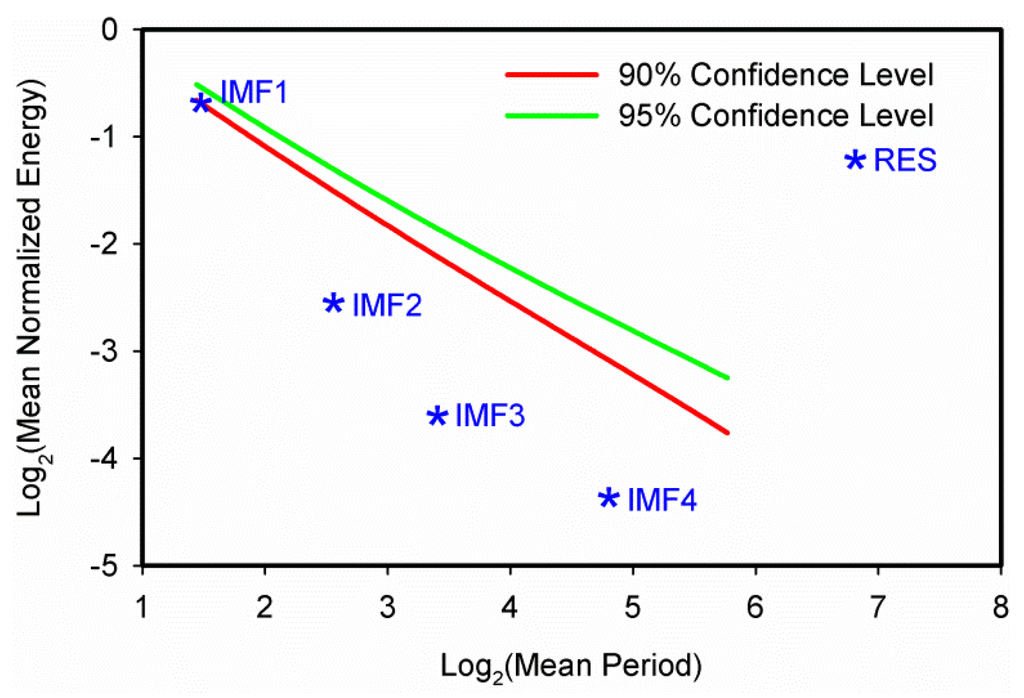 To see whether an IMF for EEMD contains a true signal or just a random noise component, the Monte-Carlo method was used to perform a significance test [44,45]. The statistical significance test for IMF components derived from white noise was established by Wu and Huang [44,45]. The true signals were determined by examining the more detailed distribution of the energy with respect to the period in the form of spectral function. The energy density of the ith IMF component (Ei) can be defined as follows [31]: