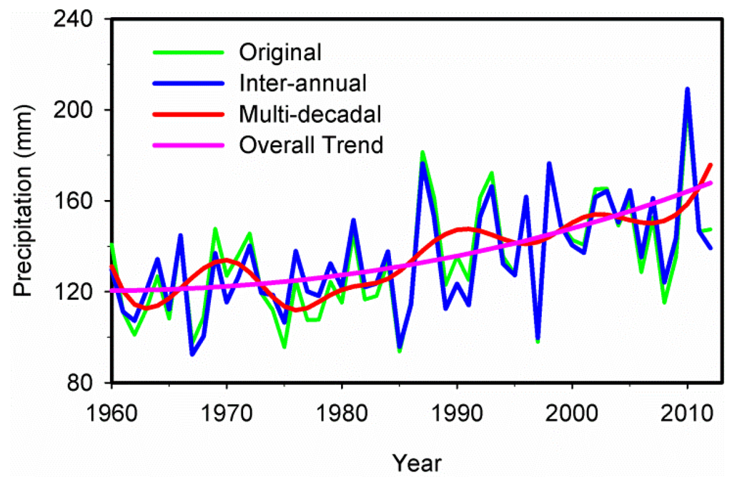 Table 2 also shows that the inter-annual oscillations are more dominant than multi-decadal oscillations in regional precipitation variation. Various trends, including the inter-annual trend (the sum of IMF1, IMF2 and the trend component), the multi-decadal trend (the sum of IMF3, IMF4 and the trend component), and the overall adaptive trend, were plotted in Figure 6. The inter-annual trend is obtained by IMF1 and IMF2 plus trend component, while multi-decadal trend is obtained by IMF3 and IMF4 plus trend component. All the different trends in comparison with the original precipitation time series were illustrated in Figure 6. It was obvious that the reconstructed inter-annual variation trend of precipitation was almost consistent with the fluctuations of the original precipitation anomaly series during the study period. However, variability with respect to the multi-decadal trend (i.e., the sum of IMF3, IMF4 and the trend component) cannot capture the anomaly series of precipitation perfectly, which may be attributed to the exclusion of small-scale fluctuations from the reconstructed multi-decadal precipitation variation. In addition, the variability with respect to the intrinsically determined overall trend (i.e., trend component derived by the EEMD) can fully reflect the regional variation in precipitation in Xinjiang during 1960–2012, indicating a major improvement over the linear trend [42,45].