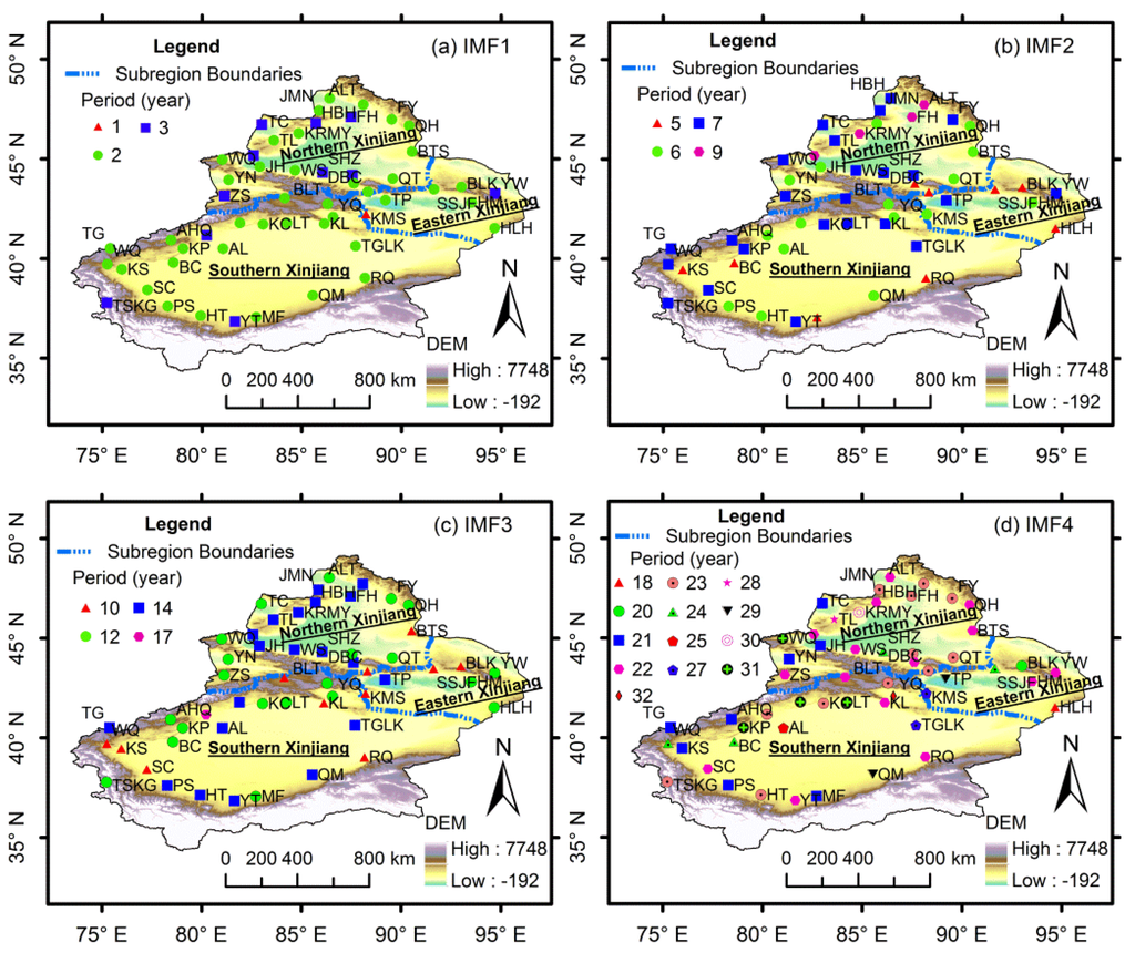 The annual precipitation series for each meteorological station in Xinjiang during 1960–2012 were also decomposed into four IMFs and one trend component using the EEMD method. The precipitation changes for each station also presented relatively stable quasi-periodic oscillation from 1960 to 2012. Figure 7 shows the spatial distribution of quasi-periodic fluctuations at the inter-annual scale (i.e., IMF1 and IMF2) and the multi-decadal scale (i.e., IMF3 and IMF4). The annual precipitation in most stations had 2–3-year (IMF1) and 6–7-year (IMF2) quasi-periodic fluctuations at the inter-annual scale (Figure 7a,b). The meteorological stations with 5-year and 9-year quasi-periodic fluctuations (IMF2) were mainly located in the eastern and northwestern Xinjiang, respectively. In addition, the precipitation in most stations had 10–14-year (IMF3) and 21–23-year (IMF4) quasi-periodic fluctuations at the multi-decadal scale (Figure 7c,d).