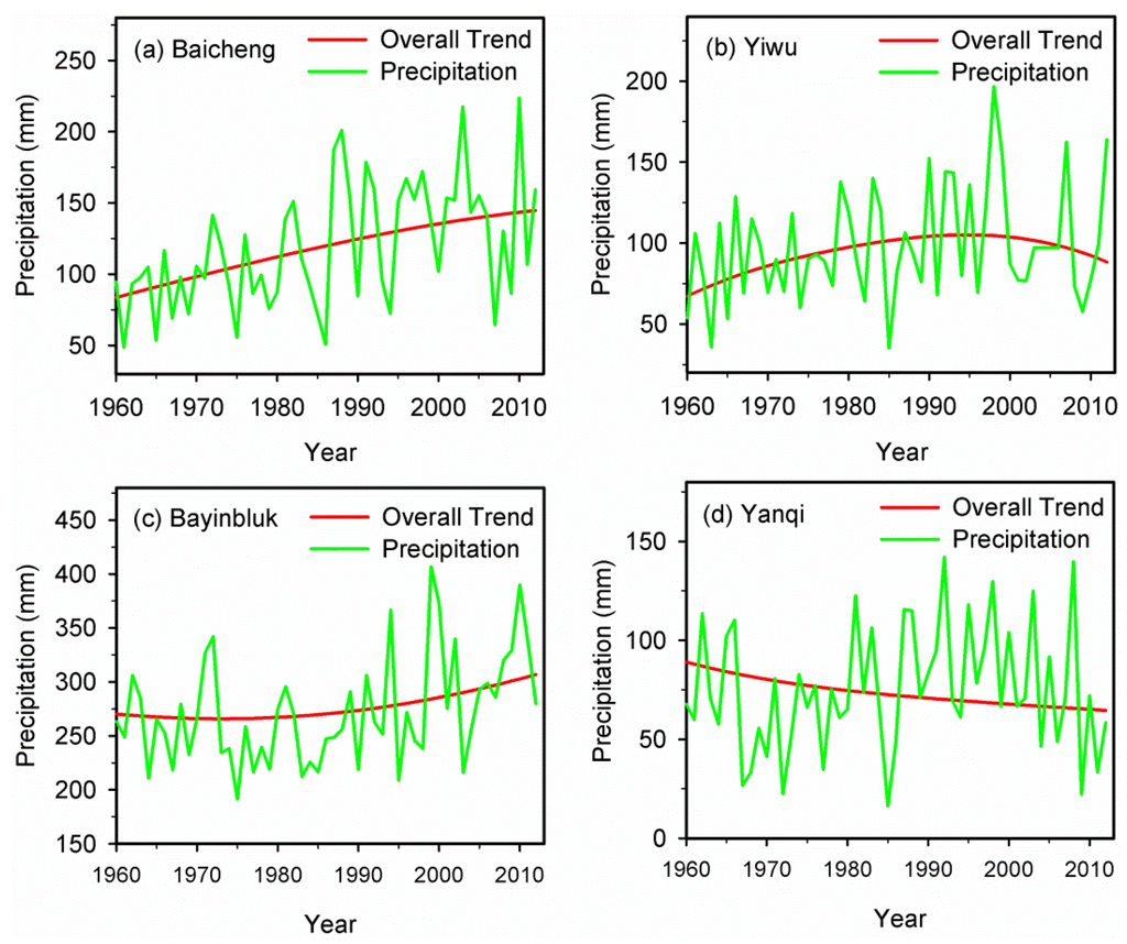 As mentioned above, the precipitation in Xinjiang showed an overall upward trend during 1960–2012. However, the variation trends differed in sub-regions as a result of the complex topography, circulation types and strength, and other factors. In order to analyze the variation trends of precipitation in each meteorological station in detail, a morphological analysis of the variation trends of precipitation with the method of EEMD has been performed in this study. The result indicated that cases have been found among the 53 stations for each of the four a priori conceivable morphological types: the type of increasing, the type of increasing-decreasing, the type of decreasing-increasing and the type of decreasing. The selected four typical meteorological stations are shown in Figure 8. The meteorological stations of Baicheng, Yiwu, Bayinbluk and Yanqi represented the increasing type, the increasing-decreasing type, the decreasing-increasing type and the decreasing type, respectively.