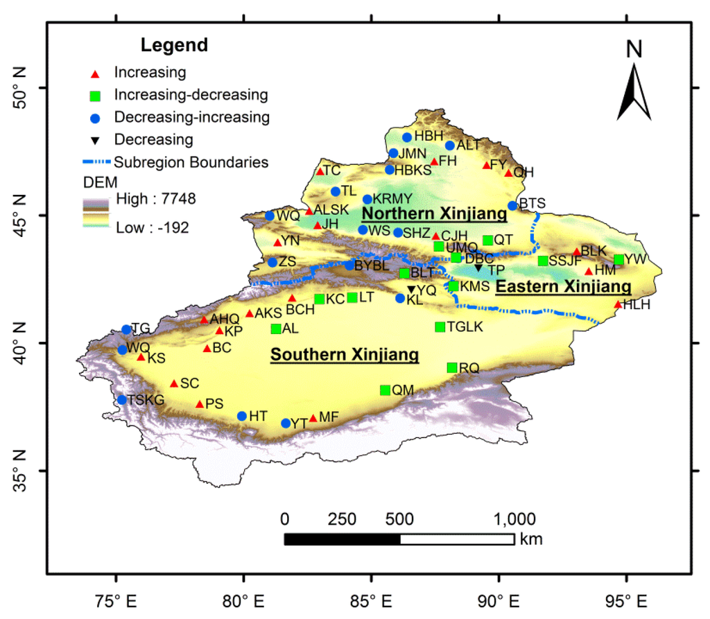 Spatial distribution of the types of variation trends in precipitation in Xinjiang is shown in Figure 9. Among all the 53 meteorological stations, there were 20 meteorological stations with the type of increasing, 13 with the increasing-decreasing type, 18 with the decreasing-increasing type and only two with the decreasing type. The meteorological stations with increasing trends were mainly located in the western Xinjiang, such as the southern part of the Ili River Valley and the southern part of the Altay Mountains which were directly related to the westerly circulation, and the Kumul Basin which was likely affected by the Siberian High and westerly circulation. Therefore, the variations of circulation factors were probably a vital reason for the increasing in precipitation in these regions. Stations with increasing-decreasing trend were mainly located in the northern and eastern part of the Tarim Basin and the middle part of Tianshan Mountains, while stations with decreasing-increasing trend were mainly located in the northwestern and southwestern Xinjiang and the south foothills of the central Tianshan Mountains. These two types of variations in precipitation may be mainly influenced by the terrain. However, the precipitation at the stations of Yanqi and Turpan showed an obviously decreasing trend.