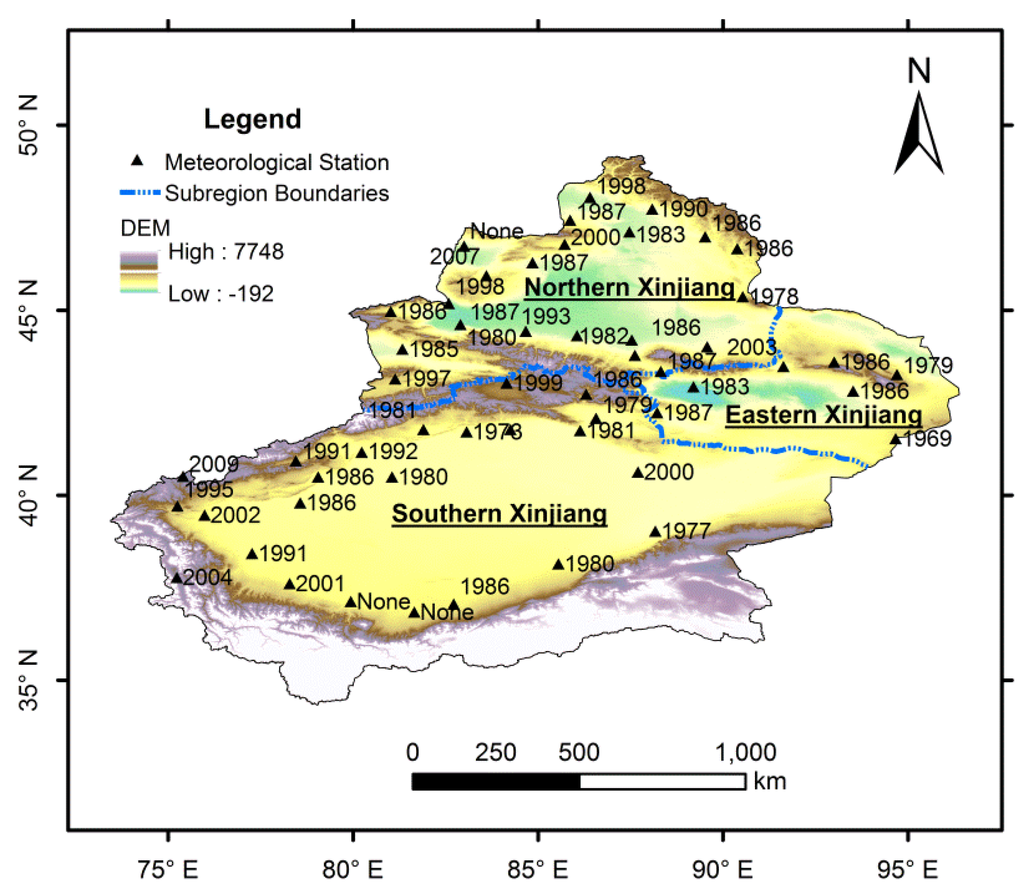 Xinjiang Province, consisting of northern, southern and eastern parts, is located in northwestern China. It lies approximately between 34°25′ N and 49°10′ N latitude and between 73°40′ E and 96°23′ E longitude (Figure 1). With an area of 1,660,400 km2, Xinjiang is the largest provincial level administrative region in China, occupying one-sixth of the total land area. There are three mountain ranges from north to south in Xinjiang: the Altai Mountains, the Tianshan Mountains and the Kunlun Mountains. Two major basins (the northern Junggar Basin and southern Tarim Basin) lie among these three mountain ranges [6]. Located in the middle part of Tarim Basin, Taklamakan Desert is the largest desert in China and the second largest shifting sand desert in the world. Gurbantunggut Desert, the second largest desert in China, lies in the central section of Junggar Basin. The Tianshan Mountains in the middle divide Xinjiang Province into two parts, named the northern and southern Xinjiang [15]. Northern Xinjiang covers Altay, Tacheng, Ili, Bortala Mongolian Autonomous Prefecture, Urumqi and Changji. Southern Xinjiang includes Aksu, Kashgar, Hotan, Bayingolin Mongolian Autonomous Prefecture and Kizilsu Kirgiz Autonomous Prefecture. Turpan-Hami Basin lies in the east part of Xinjiang, named the eastern Xinjiang. The climate in Xinjiang is featured by continental arid conditions. The total annual precipitation in Xinjiang is about 134 mm and is distributed unevenly which decreases from northwest to southeast, from windward slopes to leeward slopes and from the mountain areas to the basins. The total annual precipitations in northern, southern and eastern Xinjiang are 197 mm, 94 mm and 72 mm, respectively, with annual average temperatures of these three parts range from 4 °C to 8 °C, 10 °C to 13 °C [39] and is 5 °C to 15 °C, respectively. The average temperature in July is over 33 °C in Turpan, and the absolute maximum temperature is 49.6 °C, making Turpan the hottest place in China. The evaporation in Xinjiang is very strong (with the mean annual pan evaporation between 1000 and 4500 mm) and is 500–1000 mm higher than other regions of the same latitude in China [15].