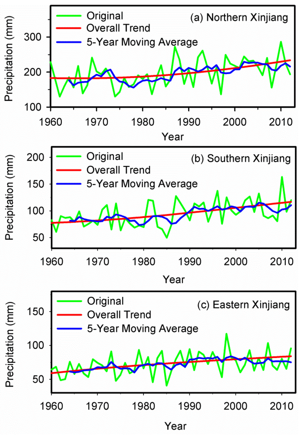 The original average annual precipitation time series and overall trends in (a) northern; (b) southern and (c) eastern Xinjiang during 1960–2012.