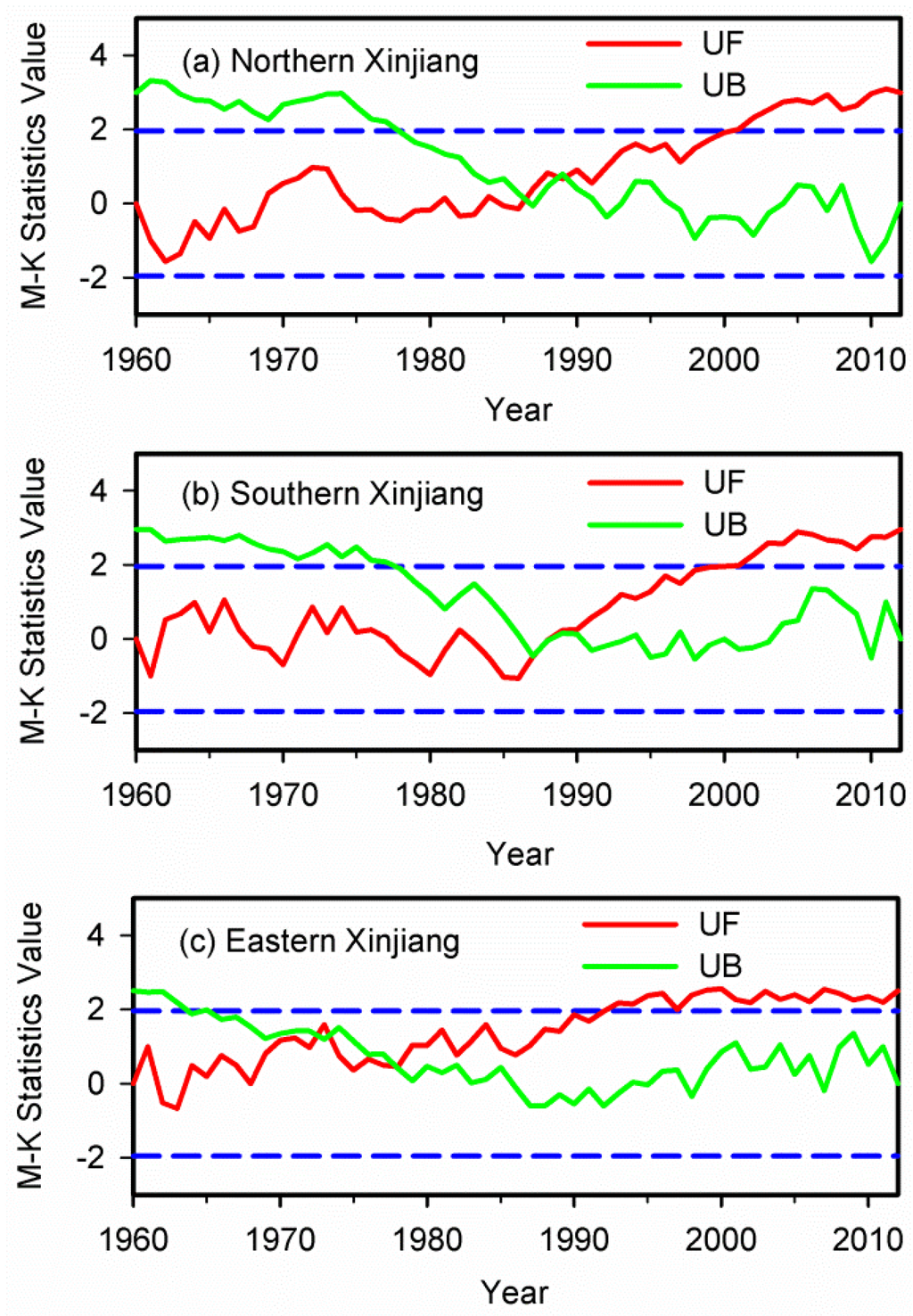 The M-K analysis results of average annual precipitation at 95% confidence level (the blue dash dotted lines) in (a) northern; (b) southern and (c) eastern Xinjiang during 1960–2012.