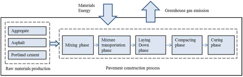 Globally, there are several tools like LEEDS and GreenRoad in the U.S. and CEEQUAL and asPECT in the U.K., available to measure the CO2 or sustainability. Other tools are available in Australia and Germany. In addition, many studies have evaluated the GHG emissions related to the highway infrastructure construction. The oversea evaluation methods and resources are mostly based on local data that are not representative of the Chinese circumstances. Moreover, some methods and software are commercial products, not available for academic research. At the present, the main challenge in the study of environmental impacts of asphalt pavement in China is a lack of project validated data and sector approved methods of life cycle carbon analysis. This study focuses on the GHG emissions of asphalt pavement construction. The process is divided into the production of raw materials, the mixture mixing, mixture transportation, paving, and rolling of the asphalt mixture. Moreover, at high temperature, the GHG emissions from asphalt mixture are included.