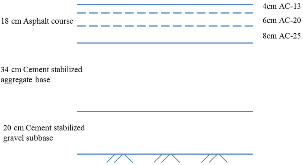 The case study is carried out on a typical four lane asphalt pavement of 20 km in length. The depth of the pavement structure is 72 cm. The width of the pavement is 28 m. The lane width is 3.75 m each. The widths of the hard shoulder and verge are 3.5 m and 0.75 m, respectively. At present, a semi-rigid base, which is usually produced from cement stabilized aggregate or gravel, is commonly used in China. The pavement structure, which consists of a cement stabilized aggregate base and an asphalt mixture surface is shown in Figure 3. The mixing plant is set up temporarily during the project. The average distance between the mixing plant and the construction site is 10 km.