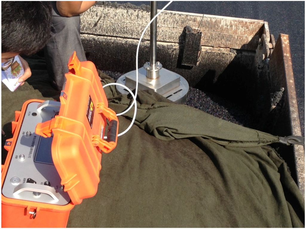 For the mixing phase, the GHG emissions come from energy consumption of mixing equipment, fuel combustion in heating the aggregate and asphalt binder, and gas emissions from the hot asphalt mixture. The control system, mixing cylinder, material transferring component, sieving and weighting components are operated by electricity. The aggregate is fed into the cold material silo by the loader machine. Fossil fuel is consumed in the aggregate and asphalt heating system. Fossil fuel and electricity are consumed in the mixing phase. CO2, CH4, N2O are generated in the mixing phase. For the transportation phase, the environmental impacts are due to the emissions released by the engines of the transport vehicles. All materials were assumed to be hauled by heavy-duty vehicles. The average fuel consumption and transportation distances were determined from literature and field data, respectively. For the asphalt mixture laying phase, the GHG comes from energy consumption of the paver and gas emission from hot asphalt mixture. For the compacting phase, the GHG comes from diesel consumption of the rollers, and gas emission from hot asphalt mixture. Figure 4 illustrates the field test results for the transportation phase. The test results are shown in the Figure 5a–c.