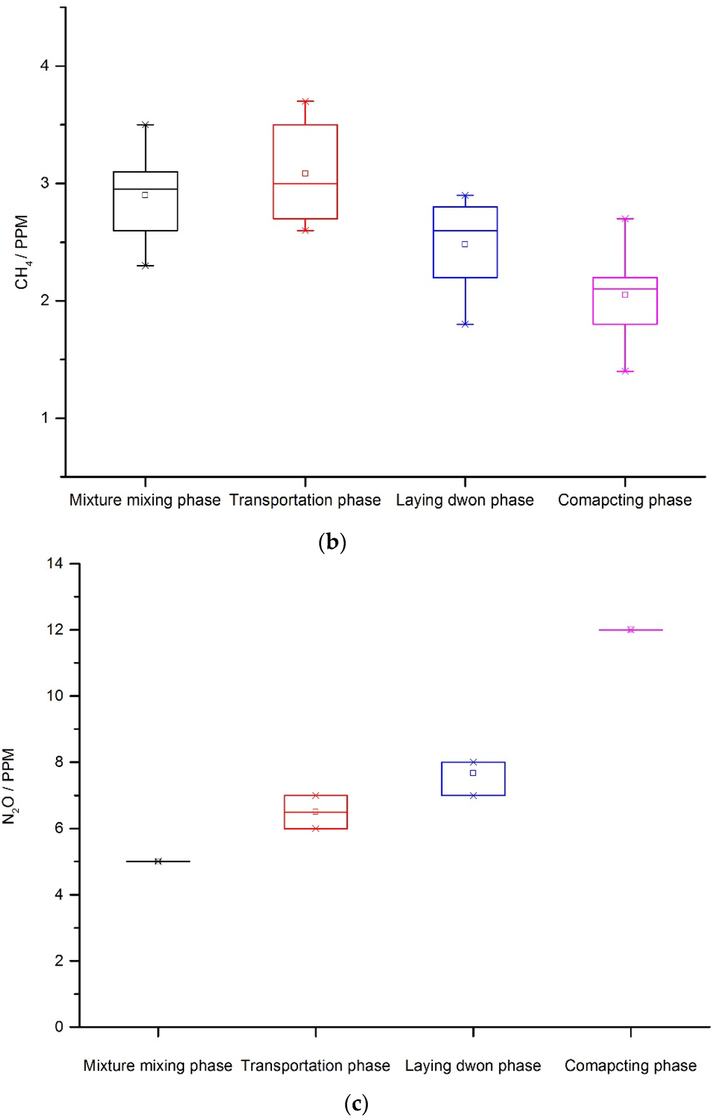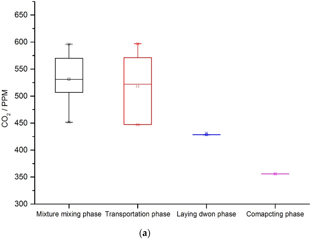 where, C is the GHG concentration in mg/m3; C′ is the GHG concentration, in ppm; M is the molecular weight; 22.4 is the average molar volume of air under standard conditions (0 °C and 101.325 kPa). During the onsite construction process, the GHG output is affected by the temperature of the mixture, emission time and surface area of the mixture. For example, in the mixture transportation phase, the mixture is typically piled up in a truck to about 1 m height. The surface area is relatively small. However, during the laying and compacting phase, the surface area of the same mixture is much larger, so different coefficients are estimated for the different construction phases. The time interval of GHG emissions is assumed for the onsite construction phase. Then, the amount of GHG is calculated for the mixture mixing phase, mixture transportation phase , laying and compacting phase.
