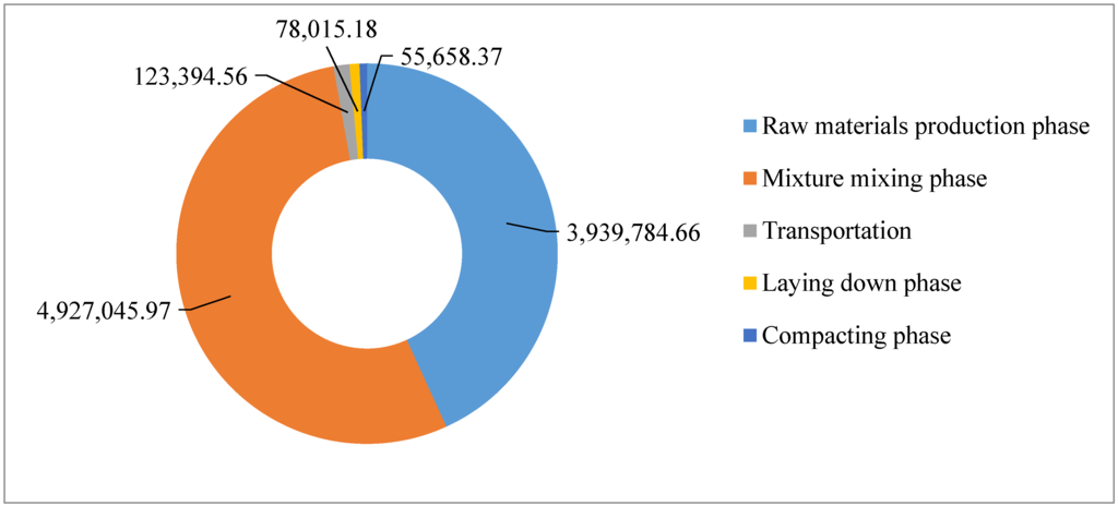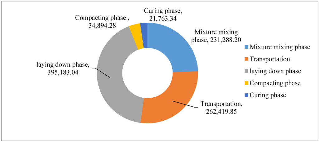 The GHG emissions of different phases in cement stabilized course construction excluding raw materials production are shown Figure 10. The total CO2e emissions are obviously small, i.e., 945,548.71 kg. About 41.79% of the GHG emissions are due to the laying phase, whereas 27.75% are due to the raw material and mixture transportation phase, 24.46% are due to the mixture mixing phase and only 3.69% and 2.30% of the GHG emissions are due to the compacting and the curing phase.