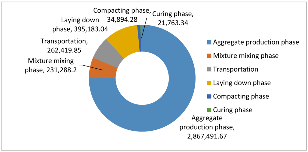The energy consumption and environmental impacts of asphalt and reinforced concrete pavement (materials and construction) were researched by Zapata [15]. According to the study, the main consumption of energy from extraction to asphalt placement occurs during the mixing and drying of aggregate (48%) for the pavement. Moreover, the production of bitumen accounts for about 40% of the total energy consumption.