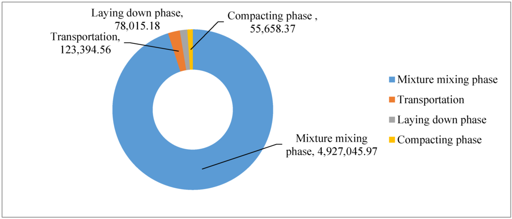 For transportation sector managers and researchers, it is important to know that the GHG emissions are due to the different phases of asphalt pavement construction. The CO2e emissions of different phases in asphalt course construction excluding raw materials production are shown in Figure 9. About 95.04% of the GHG emissions are due to the mixture mixing phase, and 2.38% of the GHG emissions are due to the raw material and mixture transportation phase. Only 1.50% and 1.07% of the total GHG emissions are due to laying phase and compacting phase, respectively.
