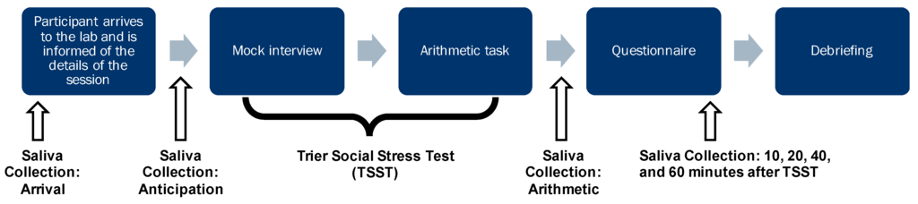 The first saliva sample, labeled “arrival”, was retrieved upon arrival to the laboratory. The participant was then escorted to a testing room and introduced to a mock panel of committee members and in their presence, explained the task instructions. These were to prepare a five-minute speech about her suitability for a mock job position and deliver it to the panel. No aids, such as notes, were permitted during the speech delivery. The arithmetic task immediately followed the speech presentation. Saliva samples were collected after the speech preparation (labeled “anticipation”) and, upon completion of the arithmetic task (labeled “arithmetic”).