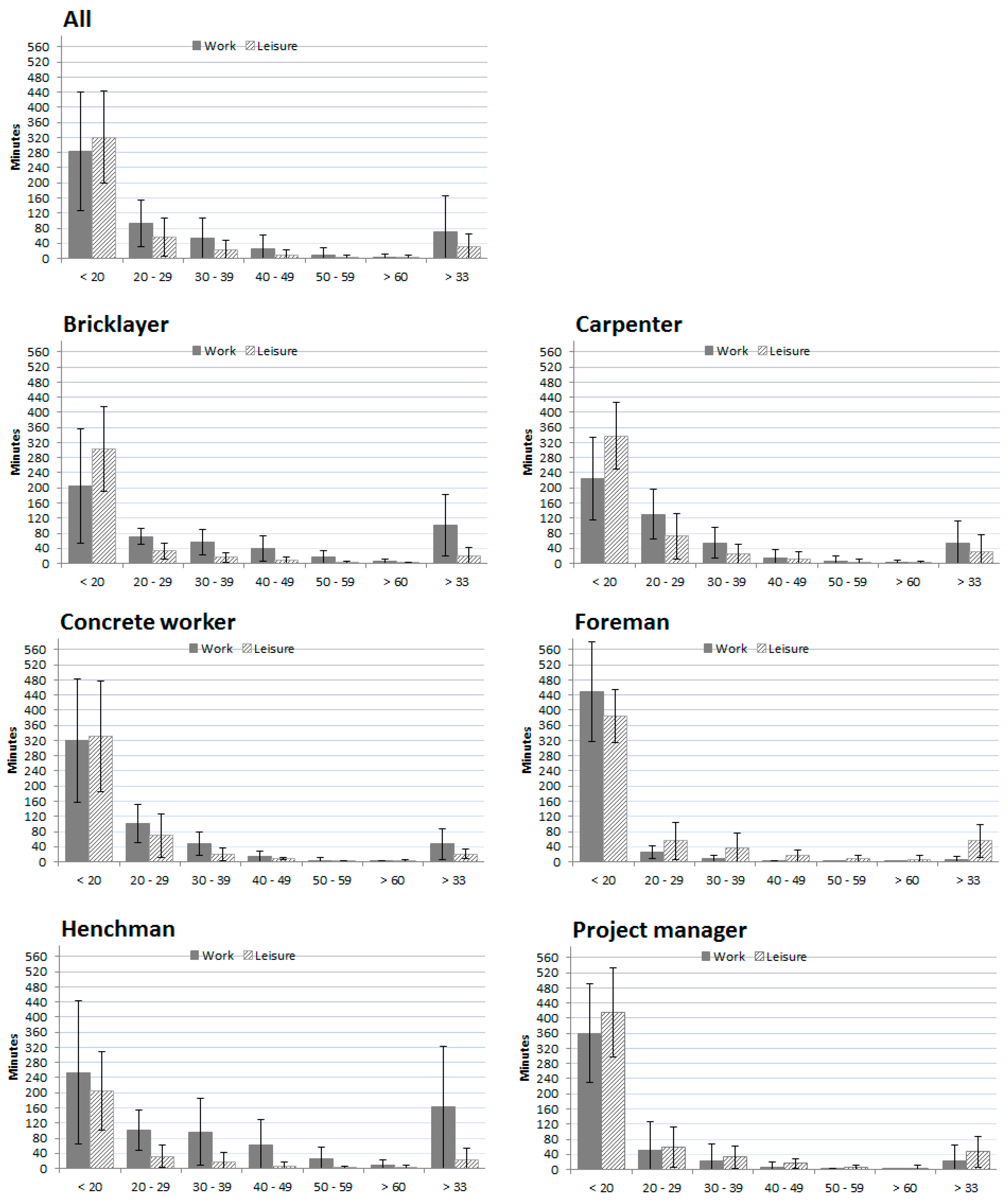Relative heart rate distribution during work and leisure presented as minutes with standard deviation. During work: All; n = 42, Bricklayer; n = 5, Carpenter; n = 12, Concrete worker; n = 8, Foreman; n = 4, Henchman; n = 8, Project manager; n = 5. During leisure: All; n = 36, Bricklayer; n = 3, Carpenter; n = 11, Concrete worker; n = 7, Foreman; n = 4, Henchman; n = 6, Project manager; n = 5.