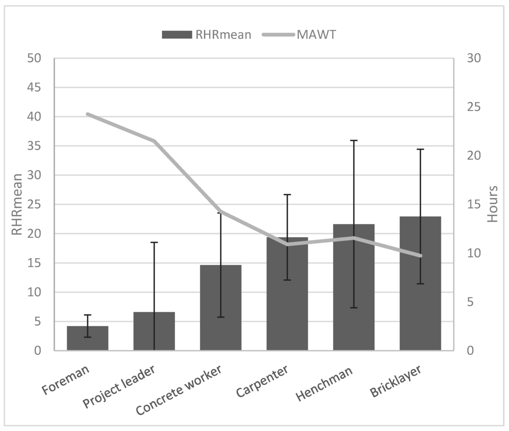 The average MAWT for this sample was 14.1 (±8.4) hours, while mean length of work shifts was 8.1 (±2.2) hours. Eight (19%) subjects exhibited work lengths exceeding mean calculated MAWT (1 out of 9 with mostly administrative tasks and 7 out of 33 with manual tasks), 34 (81%) did not. Foremen had highest and bricklayers had the lowest MAWT, see Figure 3.