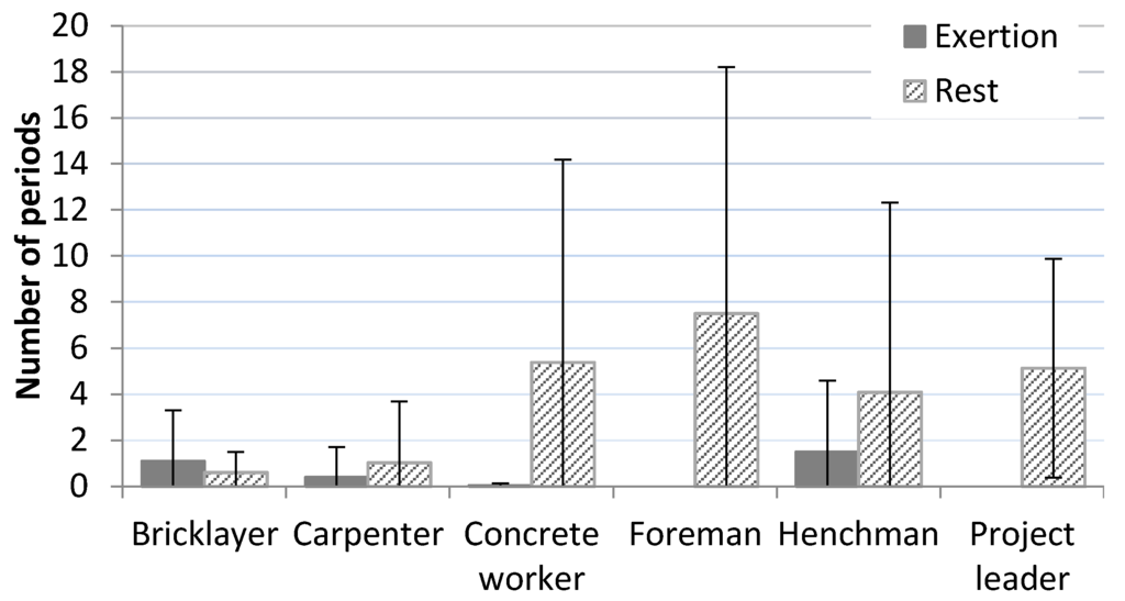 Seven persons had on average one or more episode per day of RHR above 33% continuous for 5 min duration or more (exertion periods). Five persons showed one or more episodes of 10 min or more and one person had episodes of RHR above 33% continuously for 15 min or longer. See Table 2. Henchmen had highest number of continuous periods of more than 5 min above 33% RHR, while there were no such periods among project leaders and foremen. Foremen did have the highest mean number of rest periods, defined as periods of 5 min continuously below 10% RHR, with 7.5 (±10.7), see Figure 4.