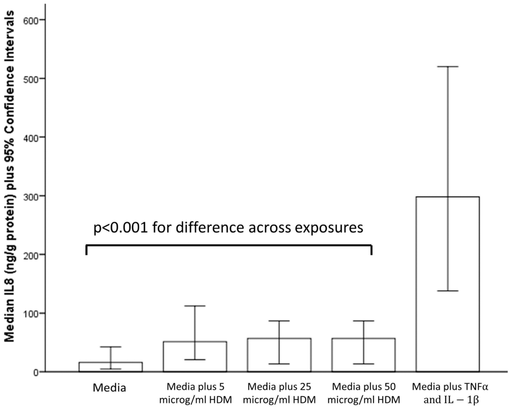 Interleukin-8 (IL-8) release from children’s bronchial epithelial cells after exposure to media alone (negative control), three different concentrations of house dust mite (HDM) and tumour necrosis factor alpha (TNFα) and interleukin-1 beta (IL-1β).