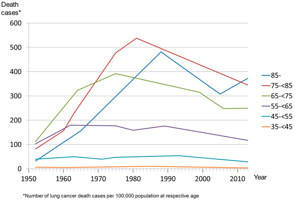 | Number lung cancer deaths | 1952–1964 | +16.6 | 1964–1994 | +7.8 | 1994–2004 | –2.6 | 2004–2013 | +7.1 | +6.81 | ||