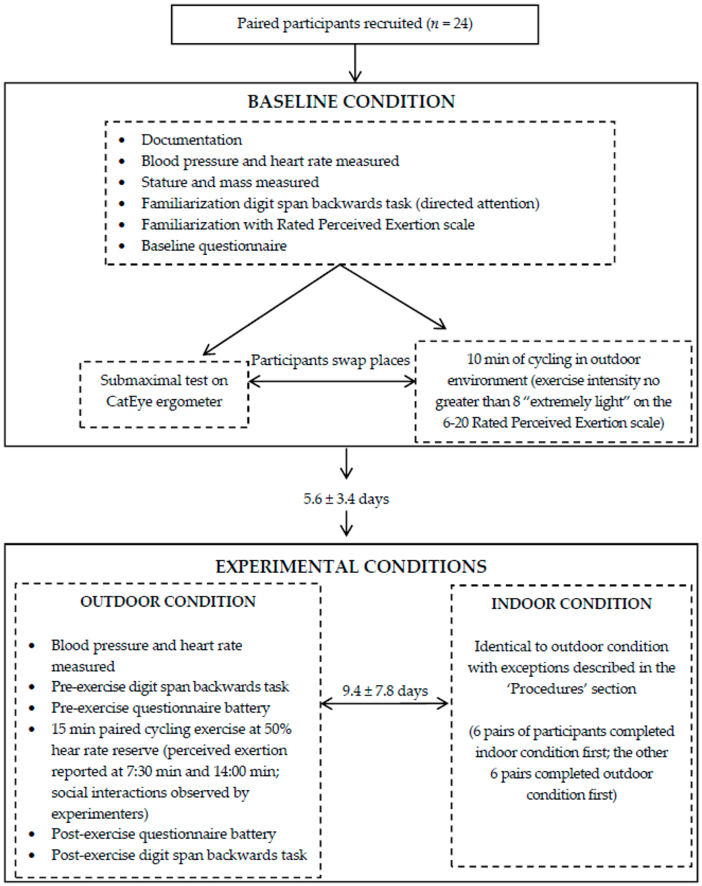 Paired participants completed experimental conditions (outdoors; indoors) in randomized, counter-balanced order; that is, 12 pairs of participants were randomly assigned to complete the outdoors condition before the indoors condition, with the remaining 12 pairs completing the experimental conditions in the opposite order. The baseline condition was used in order to familiarize participants with each of the experimental measures, equipment and routine and to obtain physiological data that enabled the calculation of each participant’s 50% Heart Rate Reserve (HRR) for use in the experimental conditions. Experimental conditions differed only by the environment in which the exercise of the session was performed.