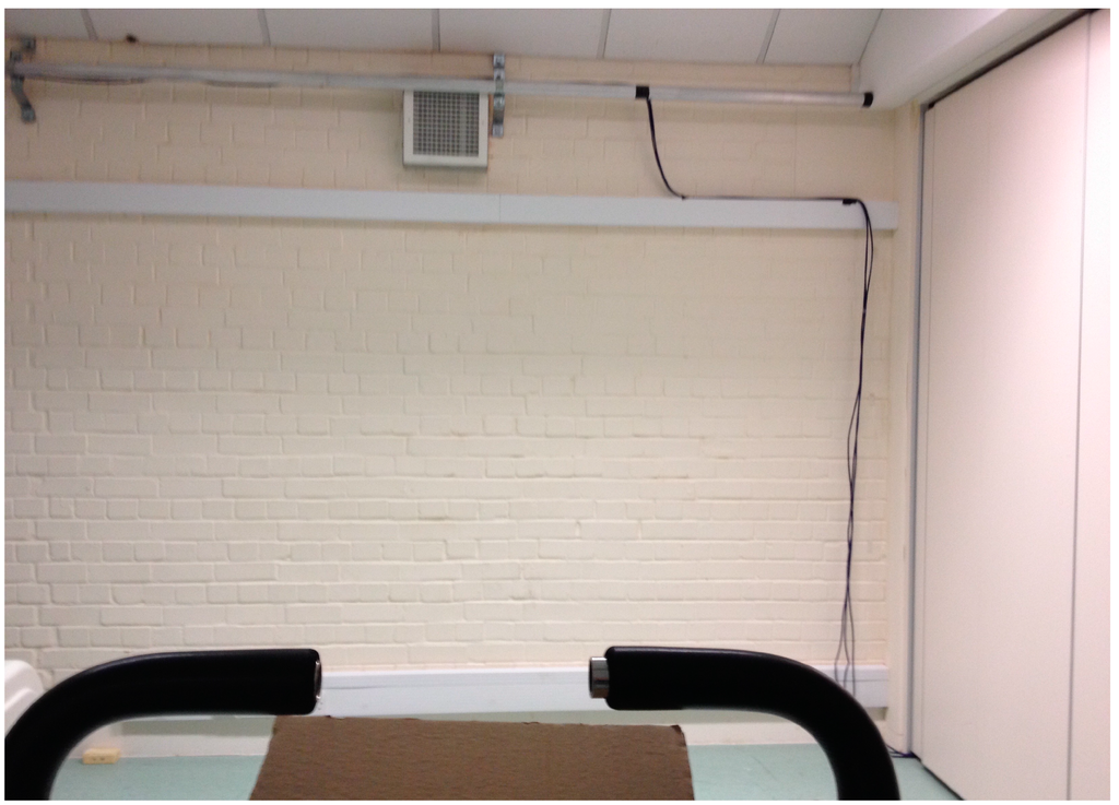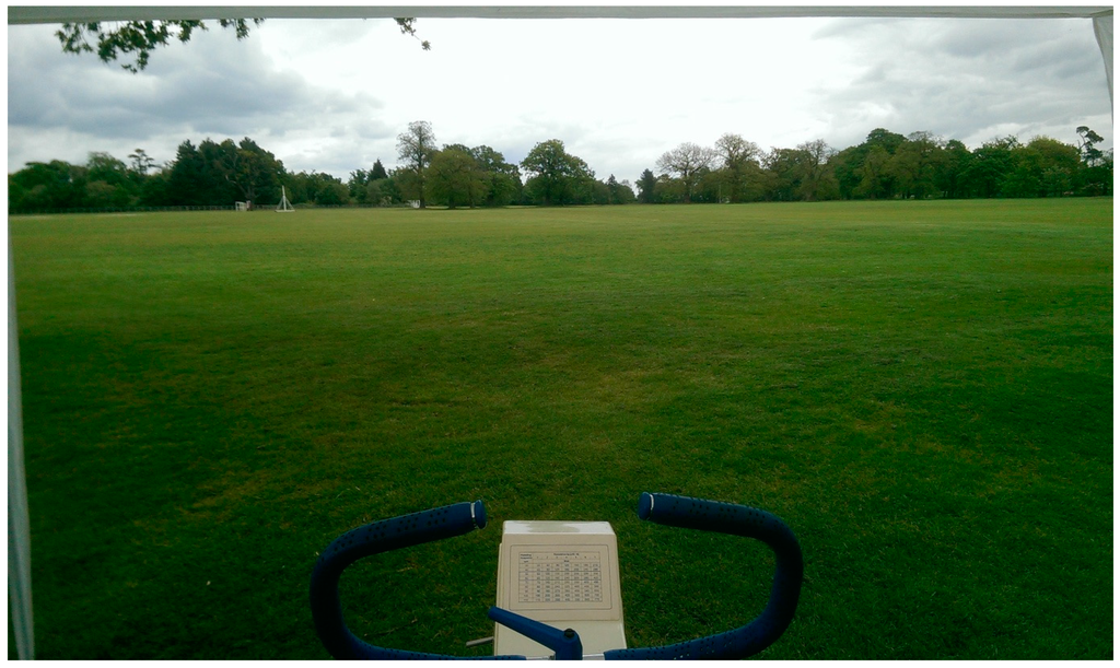 In the outdoors condition, exercise was performed outside, on the University of Essex sports fields, which is a large area of largely level gradient, maintained grassland, lined and partly interspersed with trees (see Figure 2). In the indoor condition, exercise was performed indoors, in a laboratory setting, whereby participants’ view was of a white painted brick wall (Figure 3). The dimensions of the laboratory were 8.3 m × 4.9 m. The experimenters were based at desks placed in one corner of the laboratory. Cycle ergometers were placed approximately in the centre of the laboratory, with participants’ table and chairs positioned between the ergometers and the experimenters’ desks. The laboratory was set out consistently between conditions and between participants.