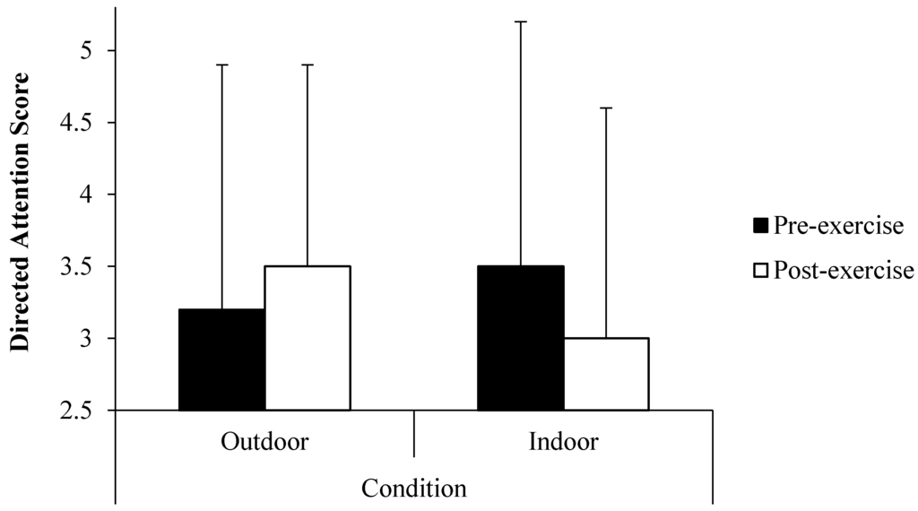 Mean (±1 SD) pre- and post-exercise directed attention scores by condition.