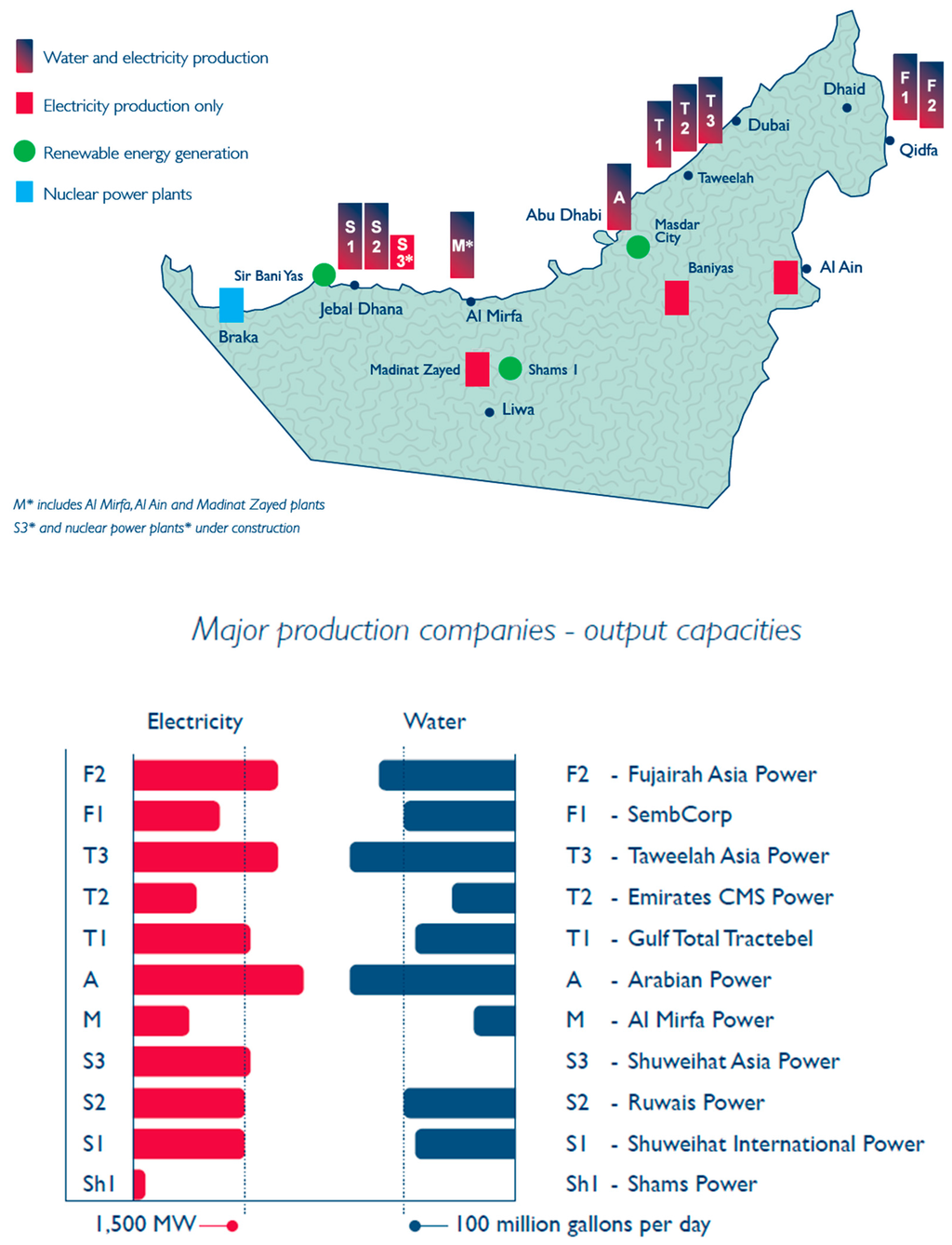 Other power only plant that have been developed or are being developed under the Abu Dhabi Economic 2030 Vision are again being used to create greater system flexibility and redundancy. They include several already installed renewable power plant’s using solar and wind technologies that are owned and managed by the Abu Dhabi Future Energy Company (commonly known as Masdar). Further, four nuclear power plants of 1400 megawatts (MW) each are under construction in the western region of Abu Dhabi. Each unit will be separately commissioned in 2017, 2018, 2019 and 2020, respectively, and will be owned and managed by the Emirates Nuclear Energy Cooperation [
