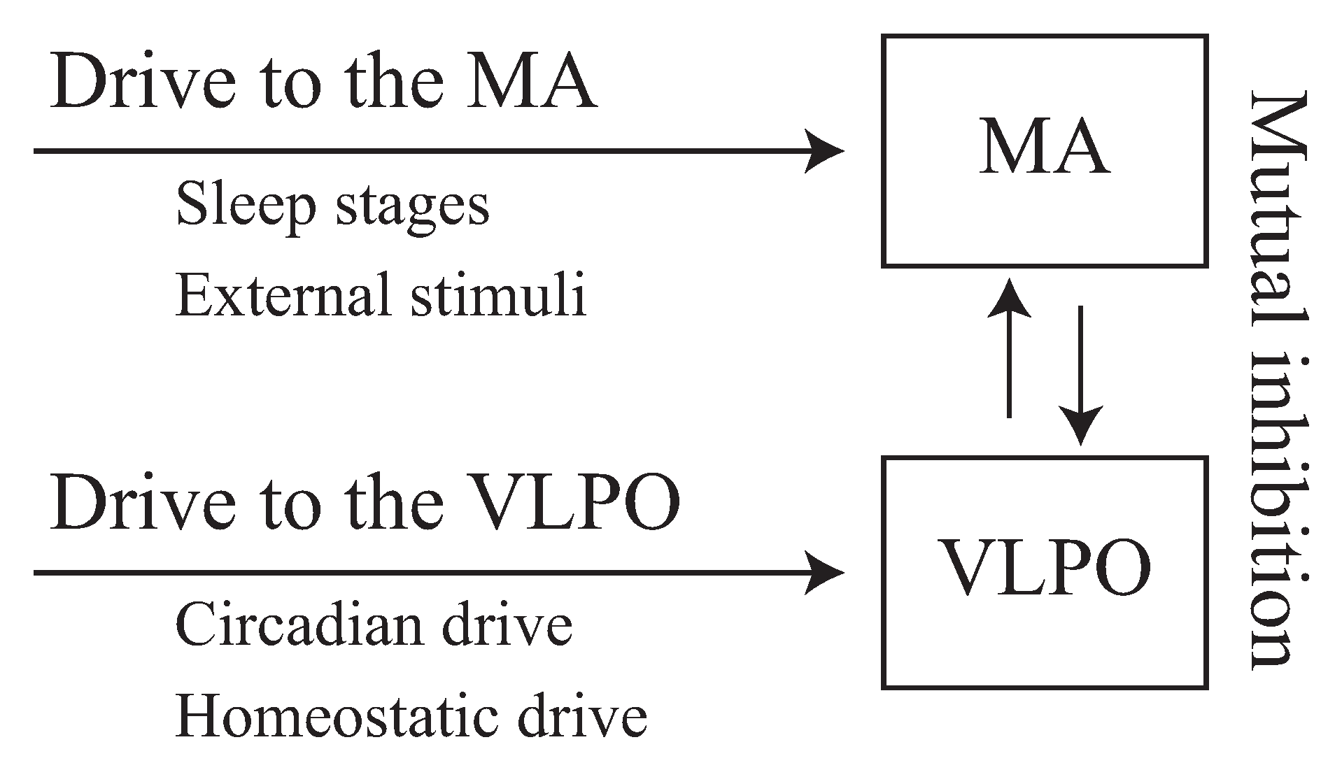 Illustration of the schematic diagram of the Phillips–Robinson model. The monoaminergic (MA) and ventrolateral preoptic nucleus (VLPO) nuclei are activated by external drives that influence sleep stages, external stimuli, as well as internal circadian and homeostatic drives. Mutual inhibition between the MA and VLPO comprises the sleep-wake switch.