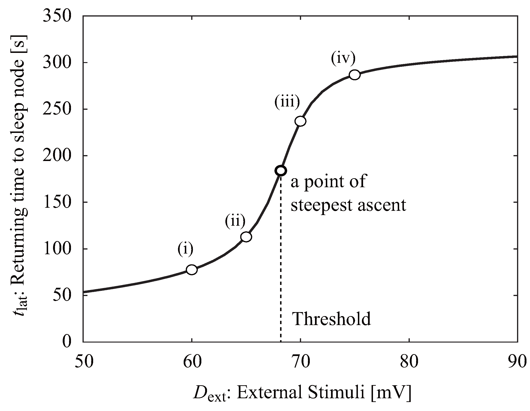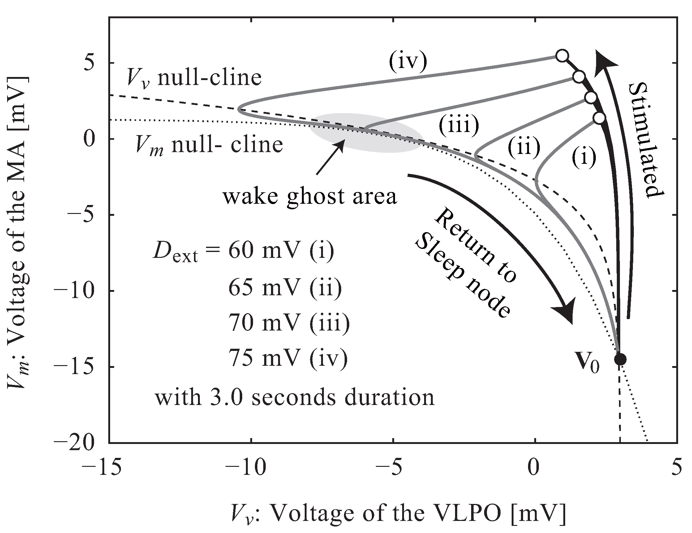 The time required to return to the sleep node, , is dependent on the voltage of the external stimulus, (Figure 3). The numbering in this figure (i to iv) correspond to that in Figure 2. If exceeds a certain value, the return time increases remarkably because returns to through the “wake ghost” area. The neuroelectrical threshold of awakening, , is defined as the external stimulus corresponding to the point of the steepest ascent.