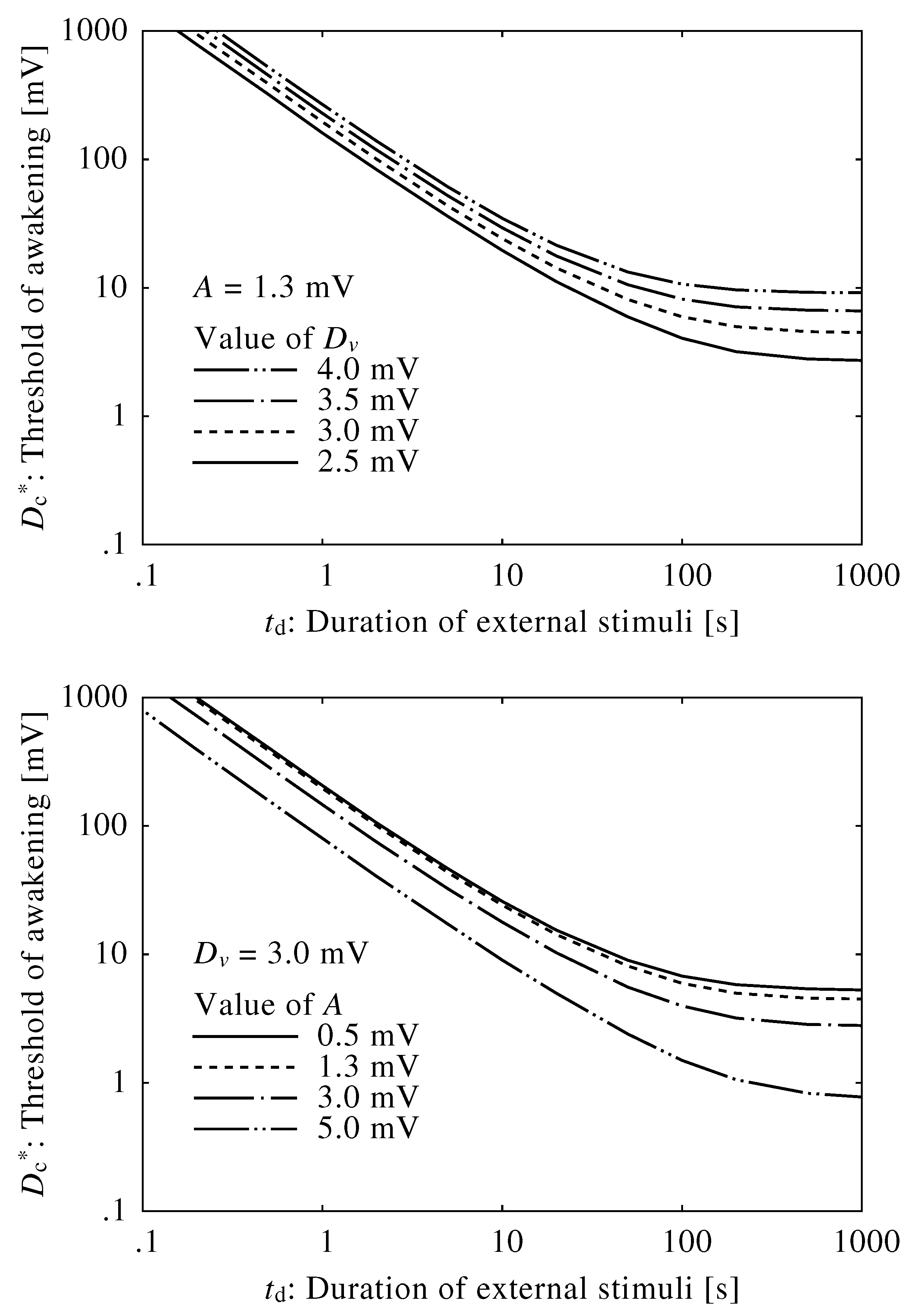 Relationship between neuroelectrical thresholds of awakening in response to external stimuli and the duration of the external stimuli using different values of and .